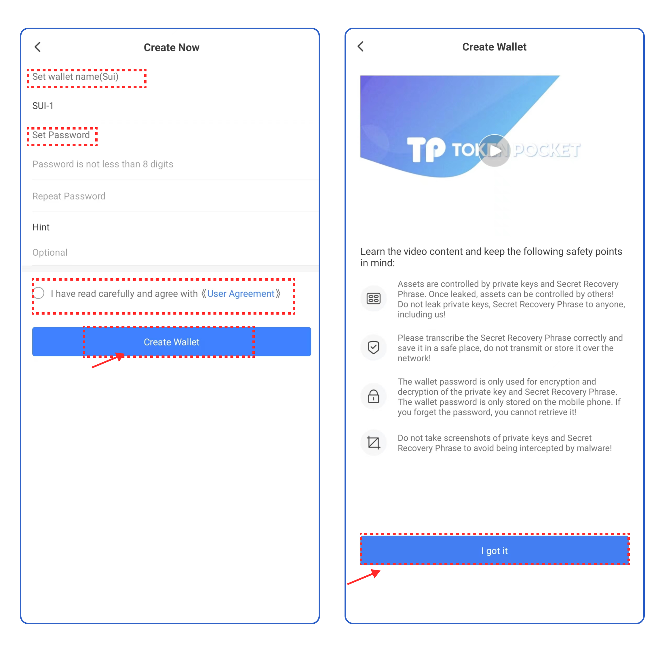 3. Set the wallet name and password, click the User Agreement, and click [Create Wallet]. Watch and learn the video content, click [I got it].