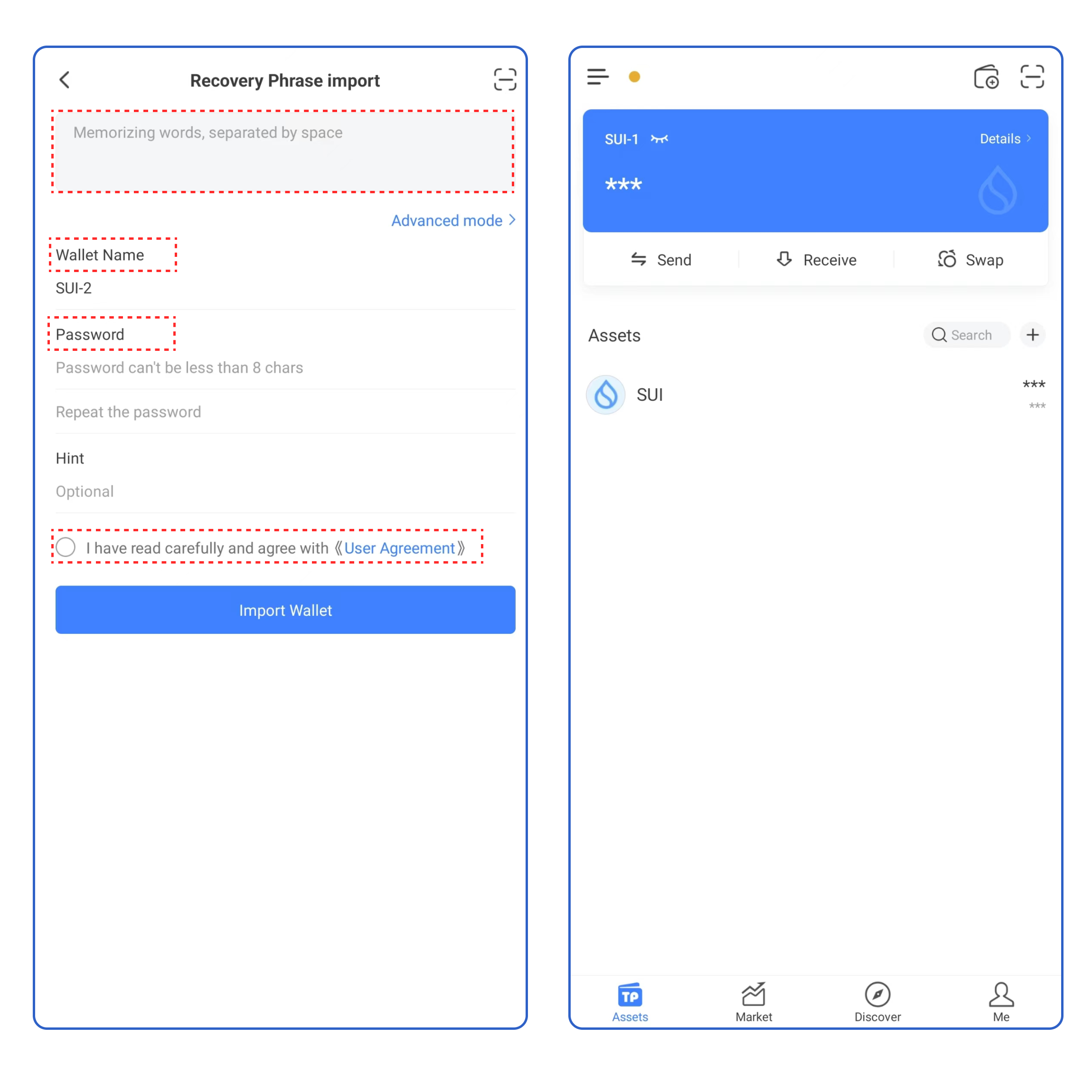 3. Take [Recovery Phrase import] as an example, enter your secret recovery phrase, wallet name, and password, click the User Agreement, and click [Import Wallet]. At this point, you have successfully imported a Sui wallet.