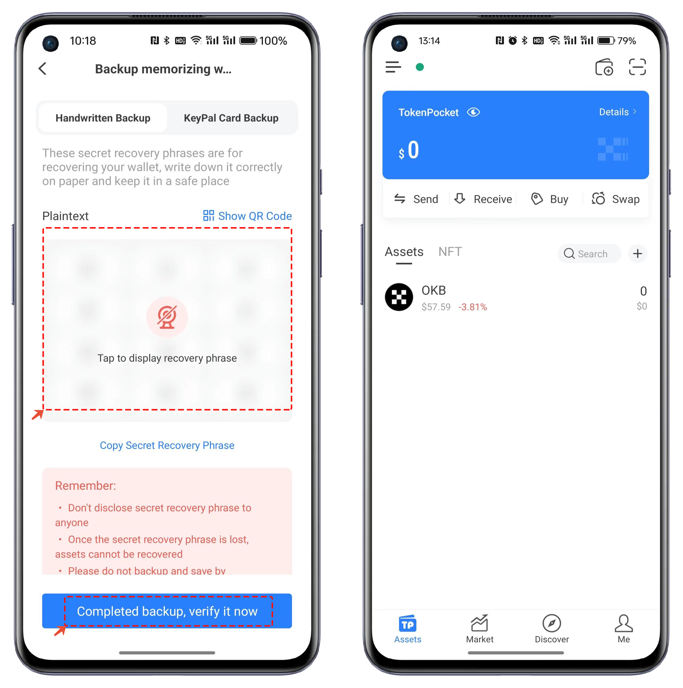 Be sure to use an offline method to back up the mnemonic phrase, and avoid loss or leakage. If the wallet was created using the Passphrase method, remember your mnemonic phrase and the set passphrase. Once the verification of the mnemonic phrase is complete, you can create a X Layer wallet.