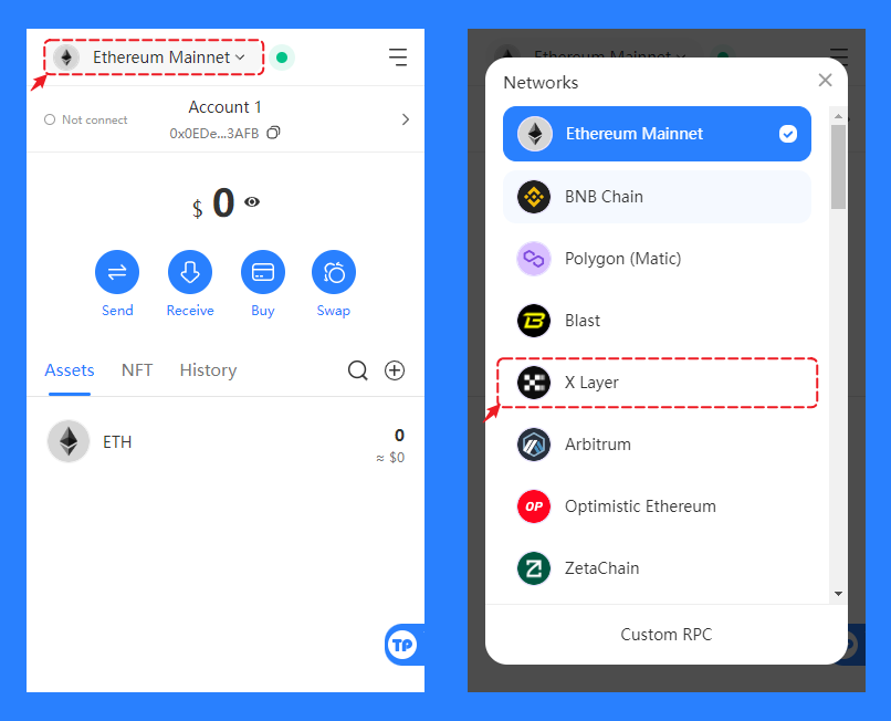 Open the TokenPocket extension wallet, click on the upper-left corner's public chain selection menu, choose the X Layer public chain in the menu, and you can directly sync to the X Layer wallet with the same address.