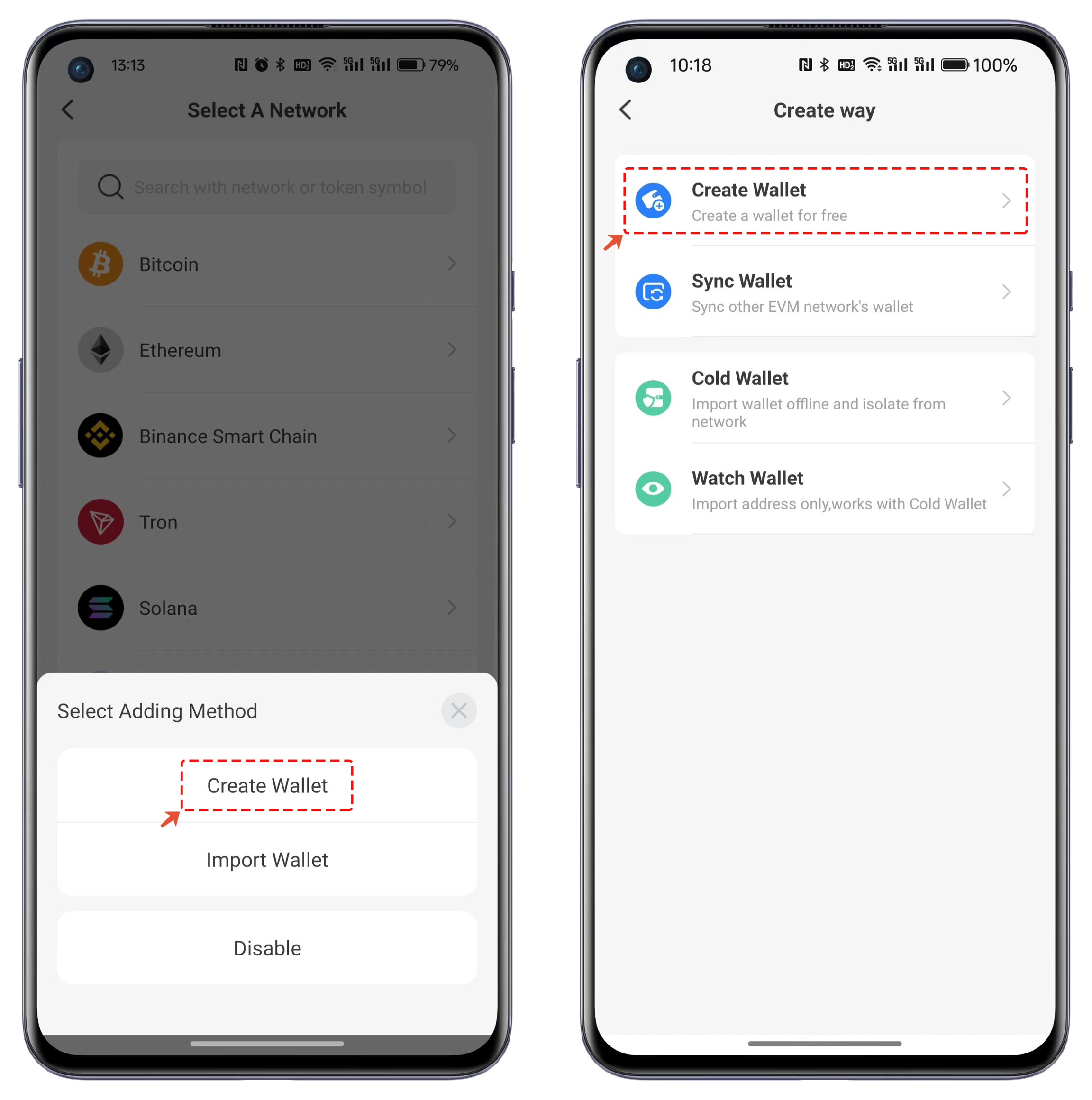 In the adding method, choose "Create Wallet." There are four options in the creation list, all of which are daily use wallet functions. Click "Create Wallet" for the first time use.