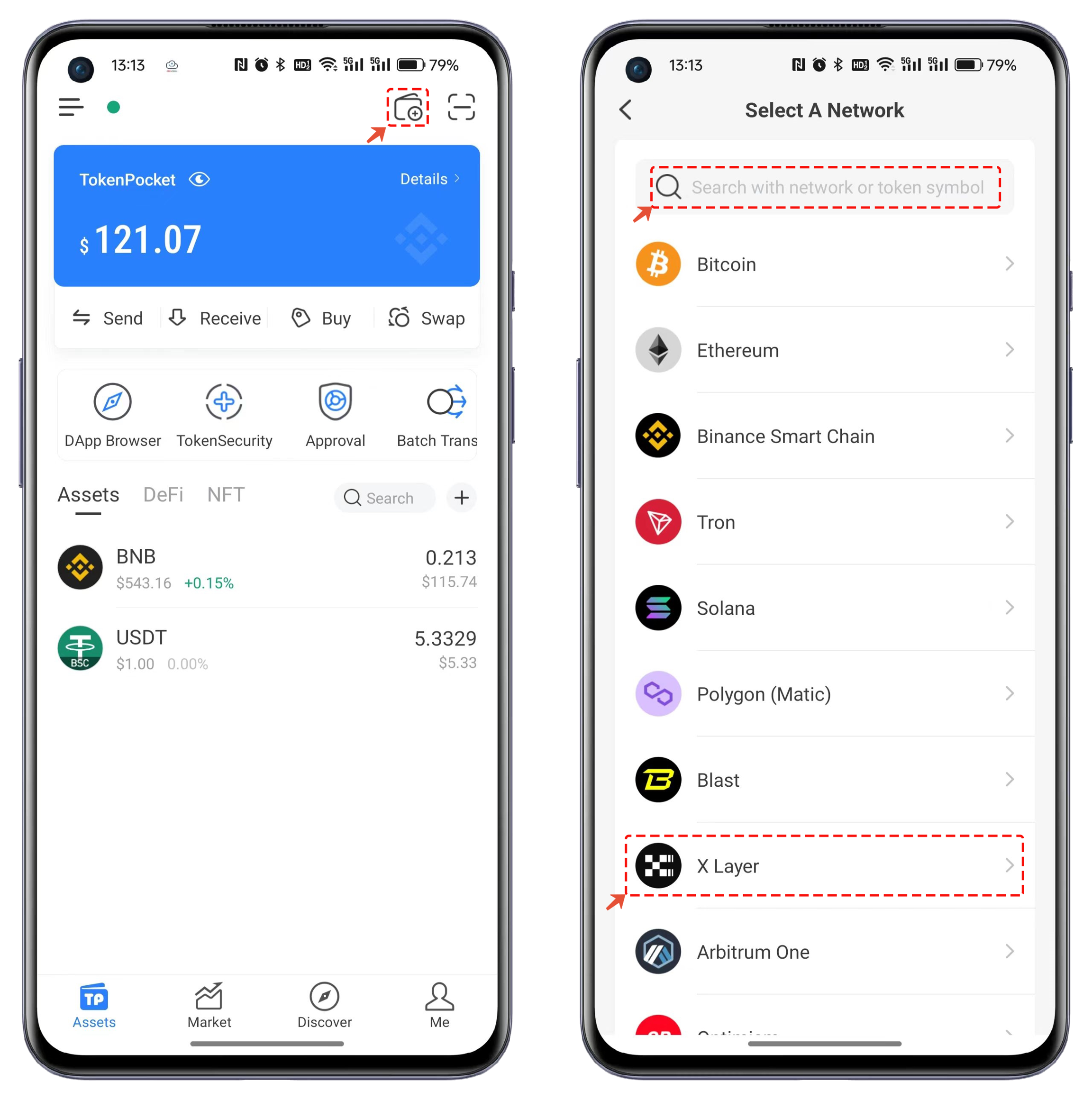 Open TokenPocket, click on the top right corner to add a wallet, search and select X Layer from the list;