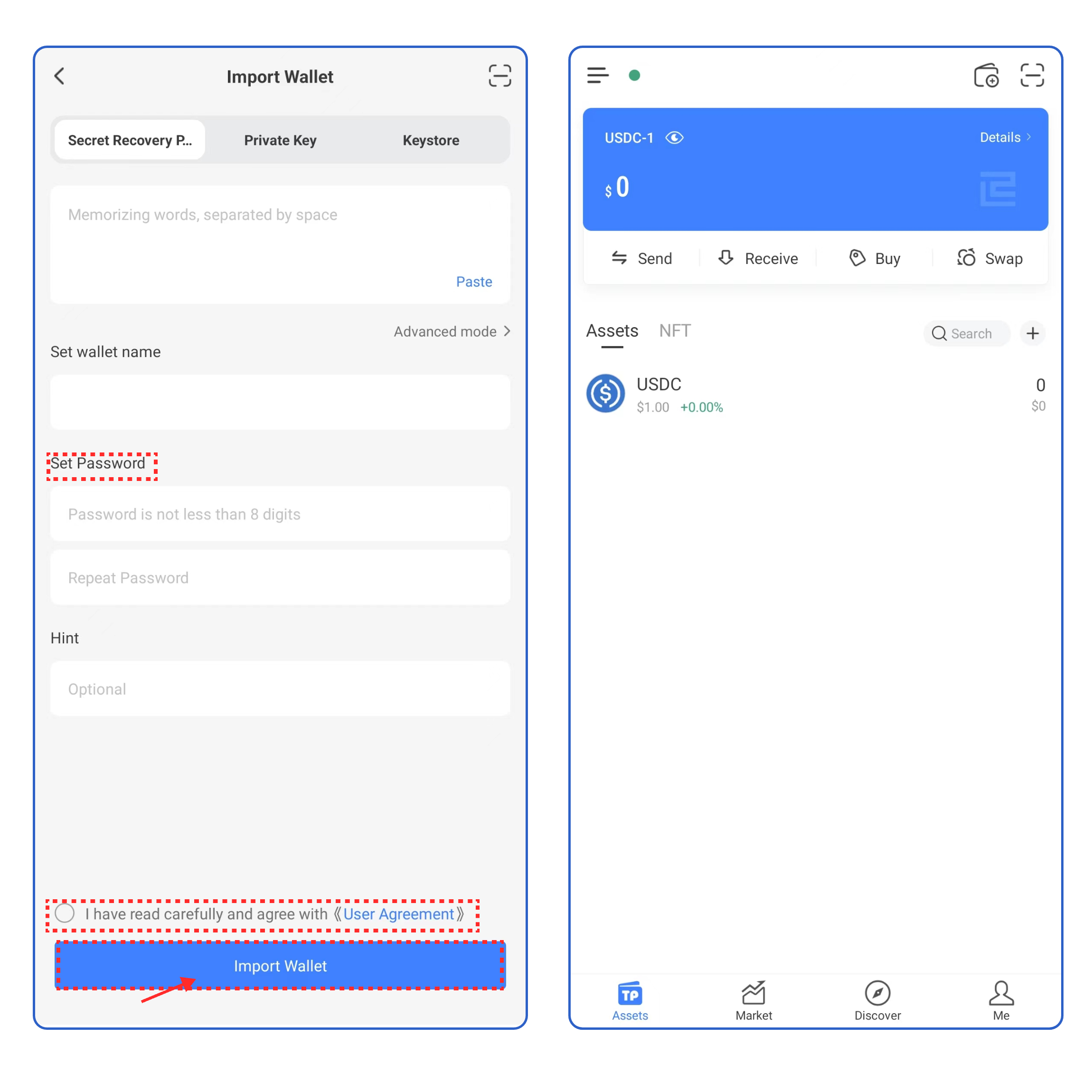 3. Take [Recovery Phrase import] as an example, enter your secret recovery phrase, wallet name, and password, click the User Agreement, and click [Import Wallet]. At this point, you have successfully imported a ZKFair wallet.