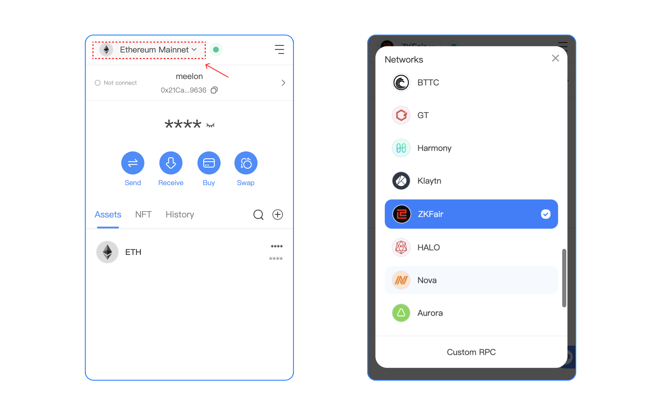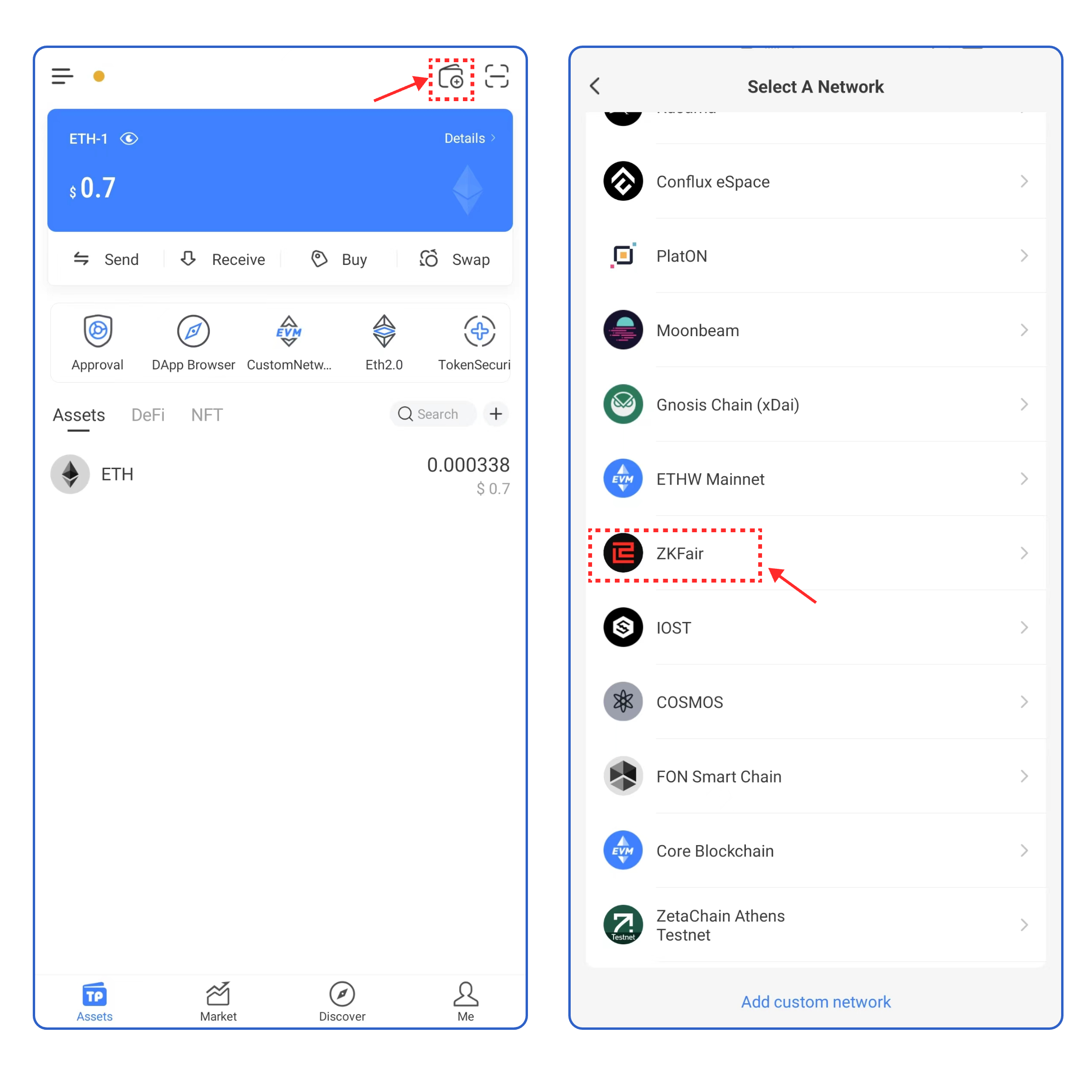 Open TokenPocket Chrome Extension, click the upper left corner to select the ZKFair Network.