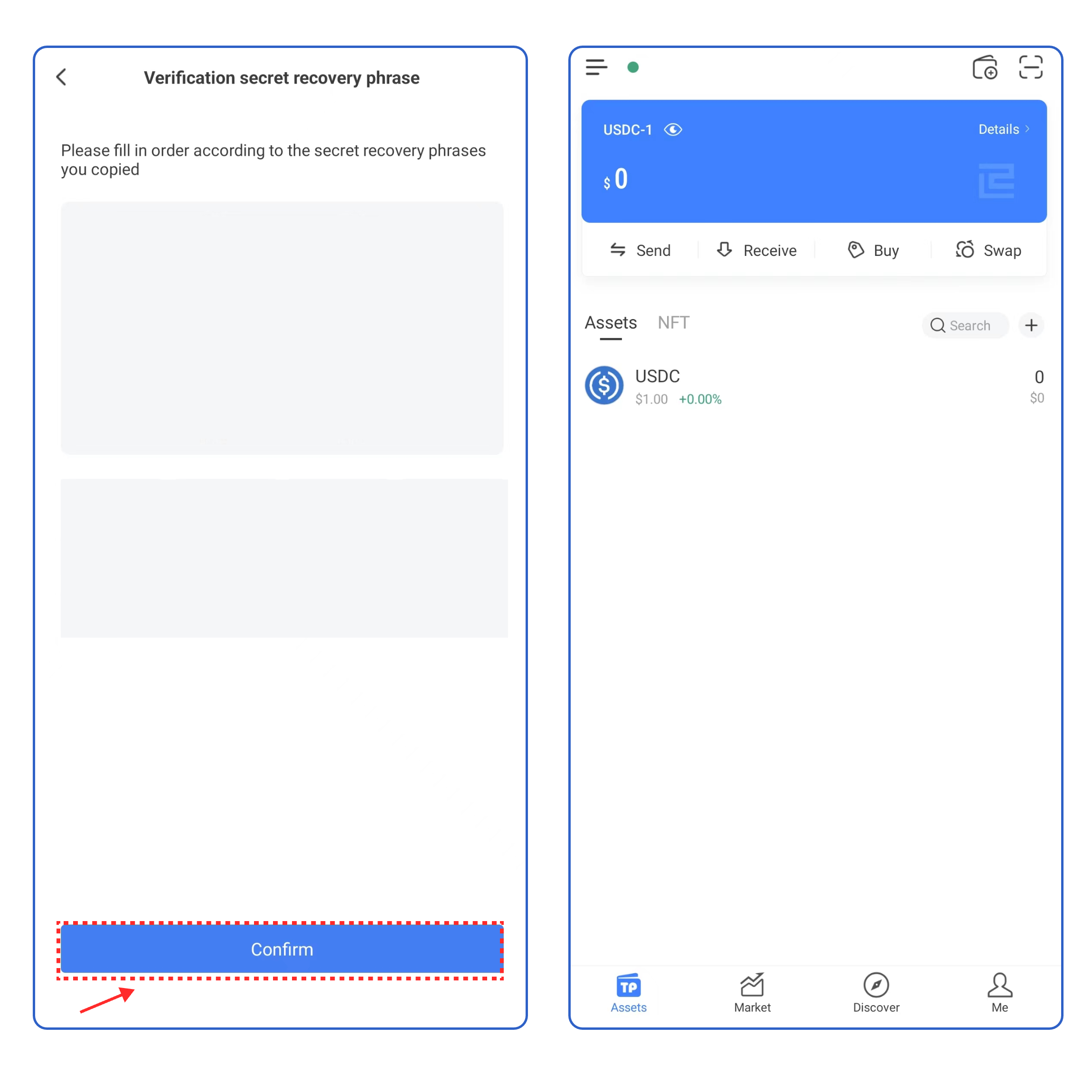 5. Enter your secret recovery phrase, and click [Confirm]. At this point, you have successfully created a ZKFair wallet.