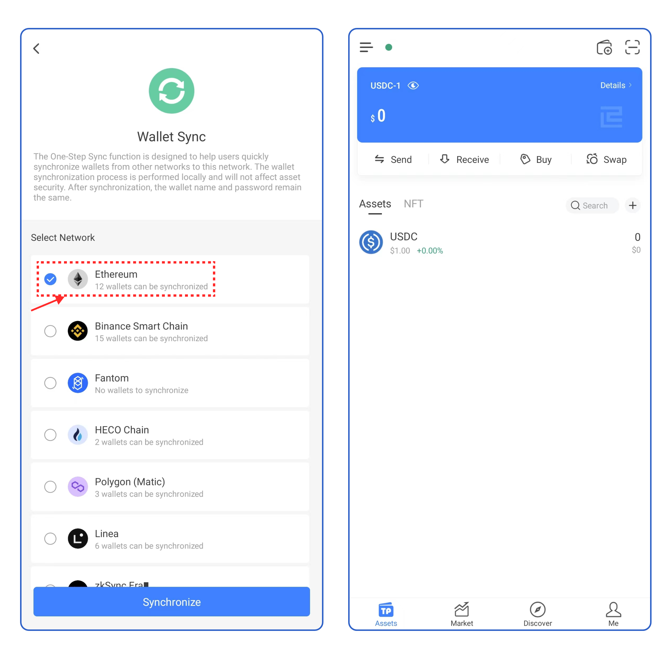 Select the network you want to sync and click【Synchronize】, you can view your wallet on ZKFair Network.