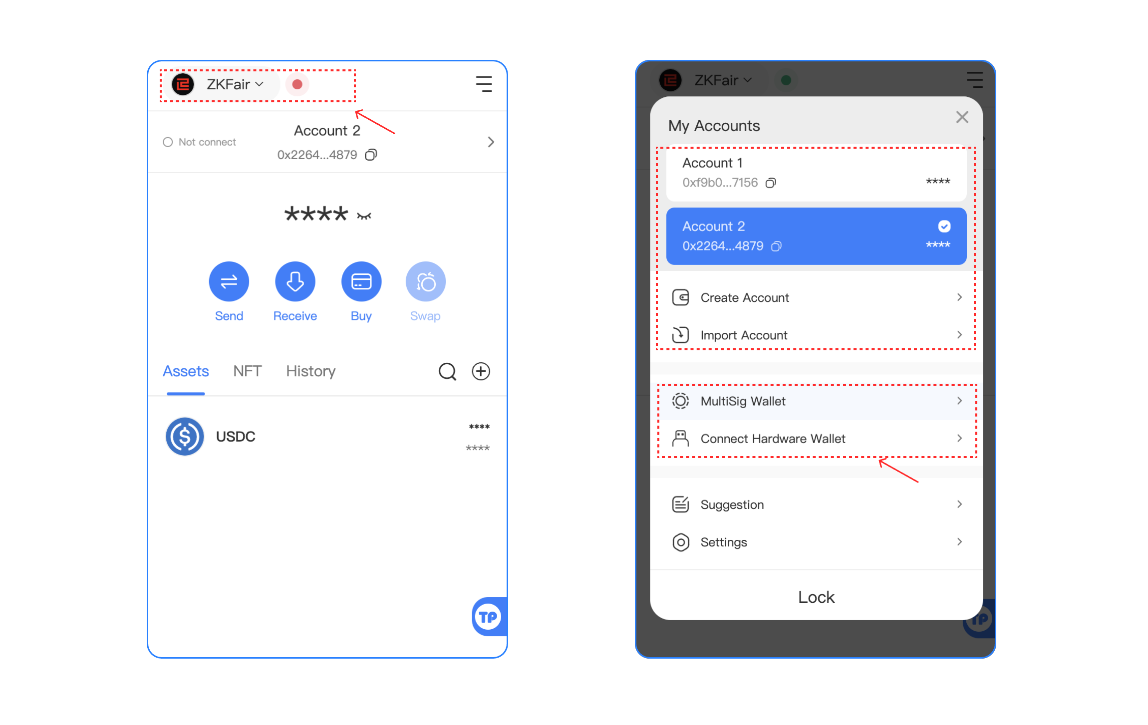 After you select, you can view your ZKFair Wallet on the Assets page, click the upper right corner to access the management page, and you can switch your wallet, and create/import your wallet on this page.