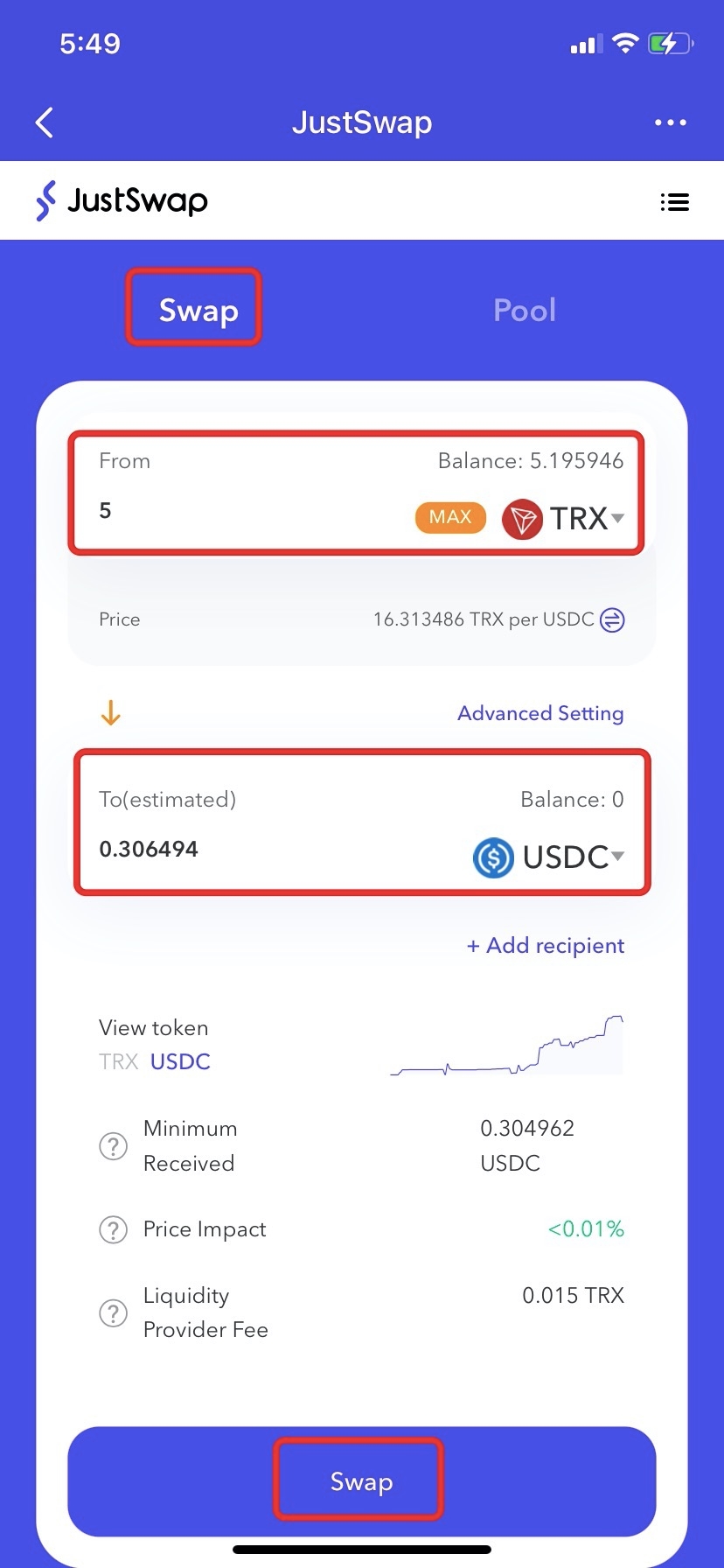2. After entering the JustSwap page, Click [Swap] at the top, select the swap token, enter the amount, and select the receiving token, then the receiving amount will be filled in automatically. Click [Swap] to proceed. (Take exchanging TRX for USDC as an example here)