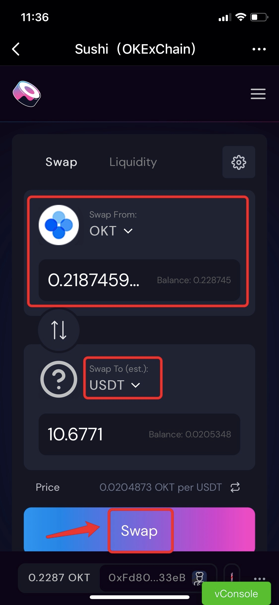 3. Select the swap token on the [Swap] page, enter the amount, and select the receiving token, then the receiving amount will be filled in automatically. Click [Swap] to proceed. (Take exchanging OKT for USDT as an example here)