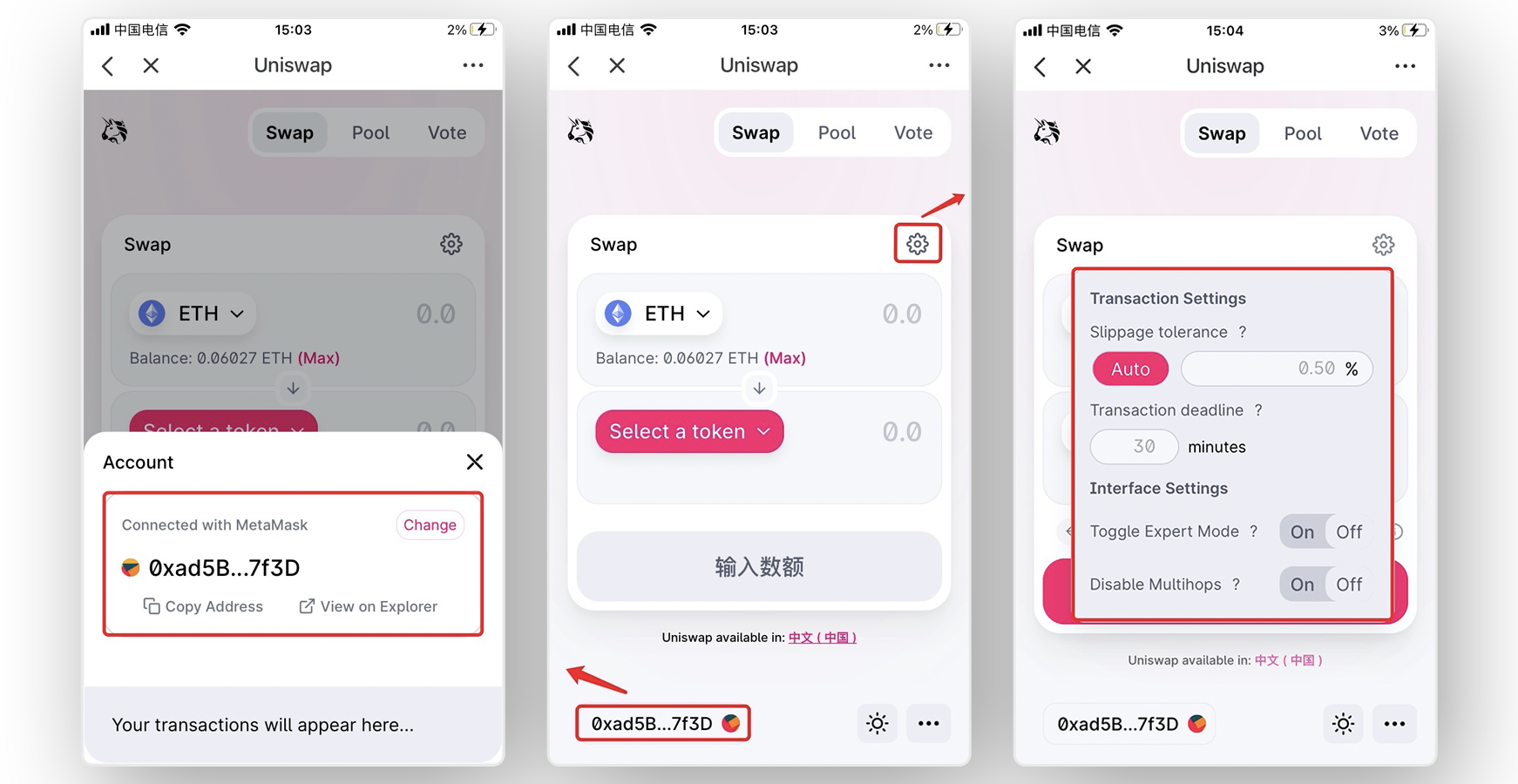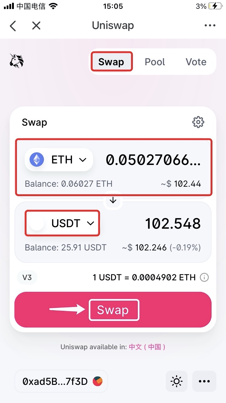 2. After entering the [Swap] page, enter the token name and amount you need to transfer, choose the receiving token (Selecting a token by searching the contract address is recommended), and the amount will be matched by default. After that, click [Swap] to procceed. (Take ETH swap to USDT as an example here)