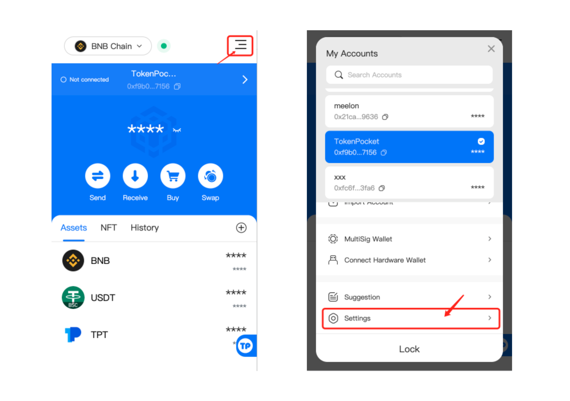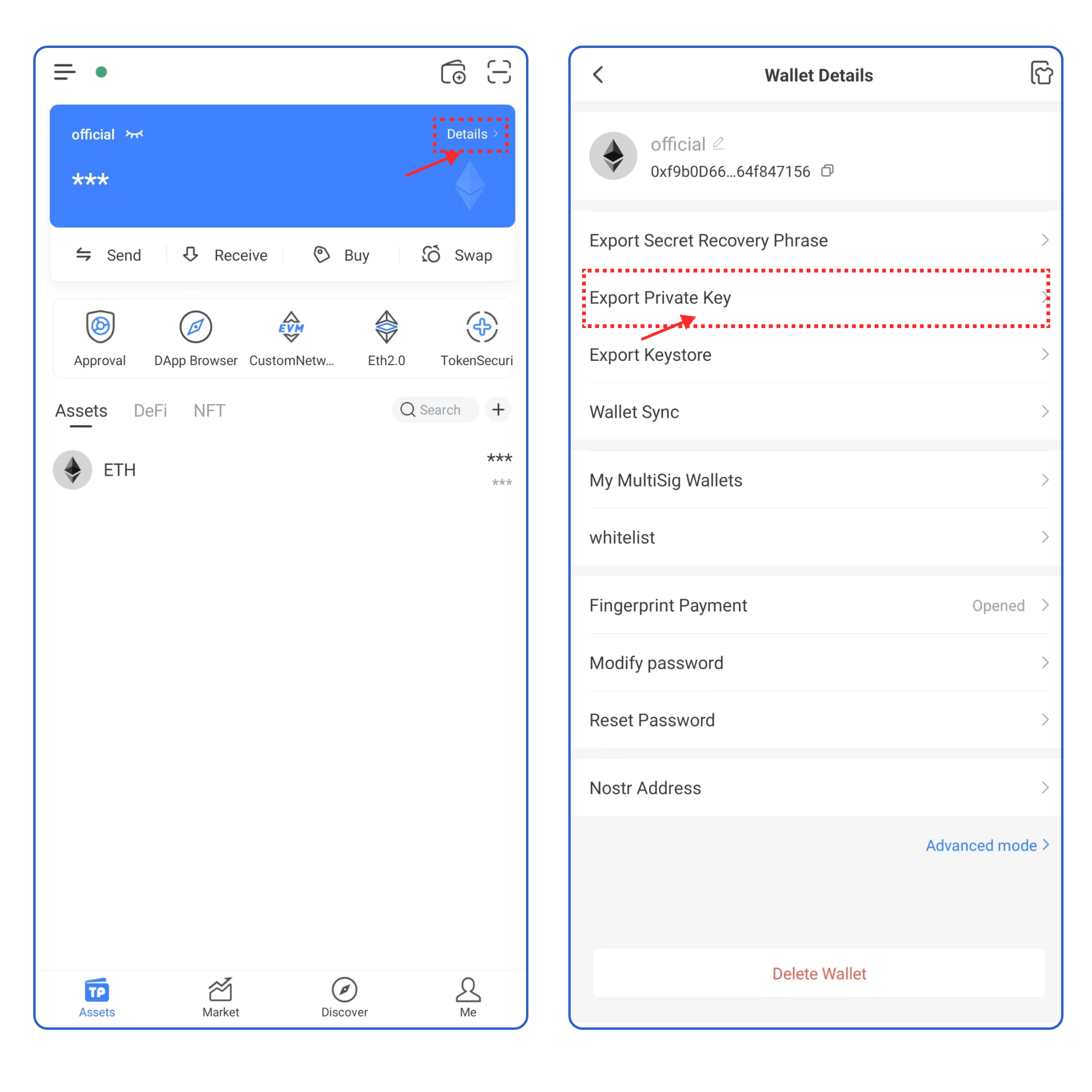 Open TokenPocket [Assets] page, click [Details], then click [Export Private Key].