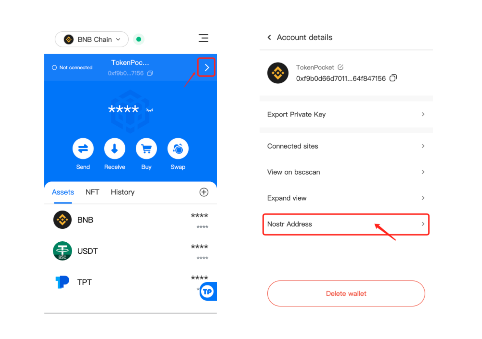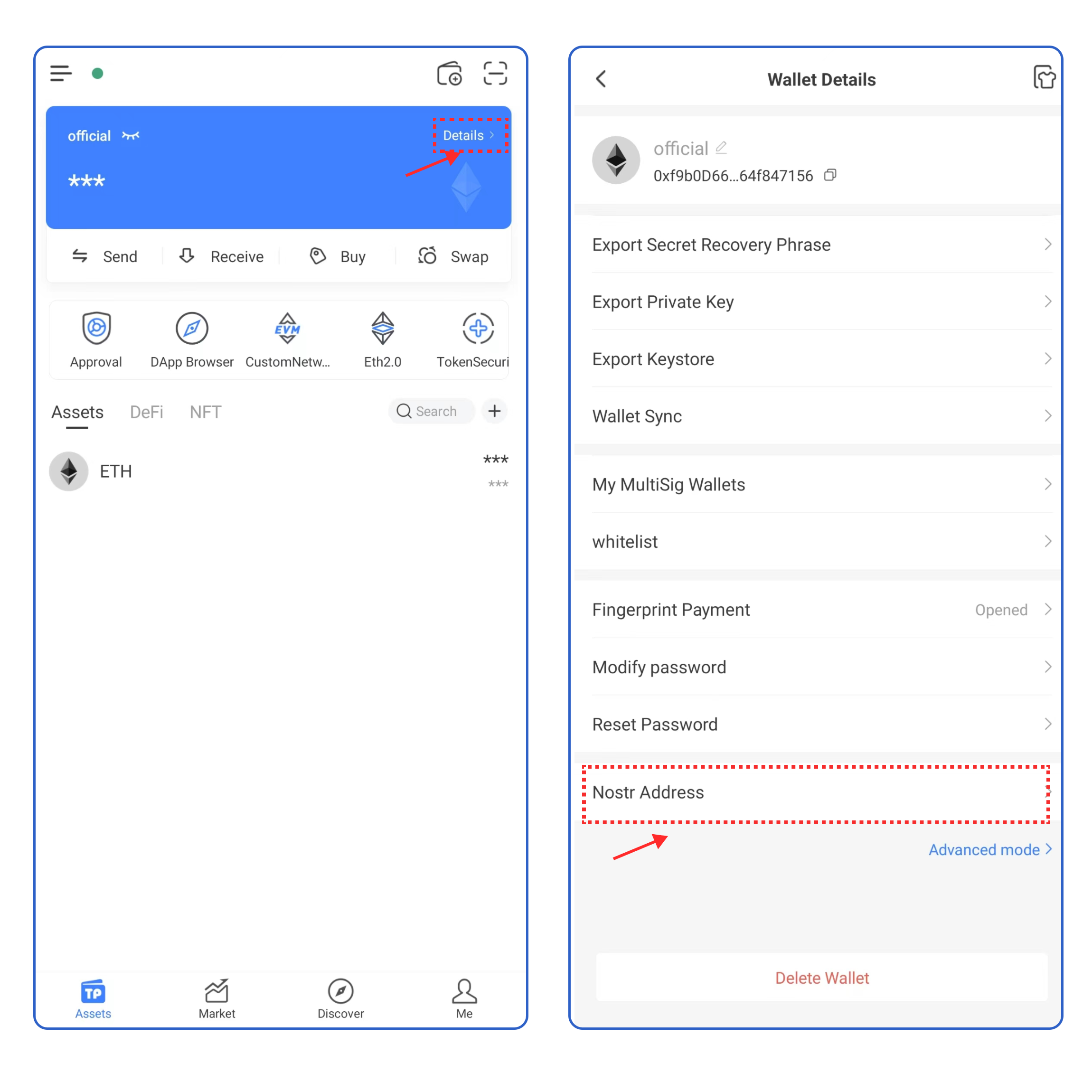 Open TokenPocket [Assets] page, click [Details], then click [Nostr Address].