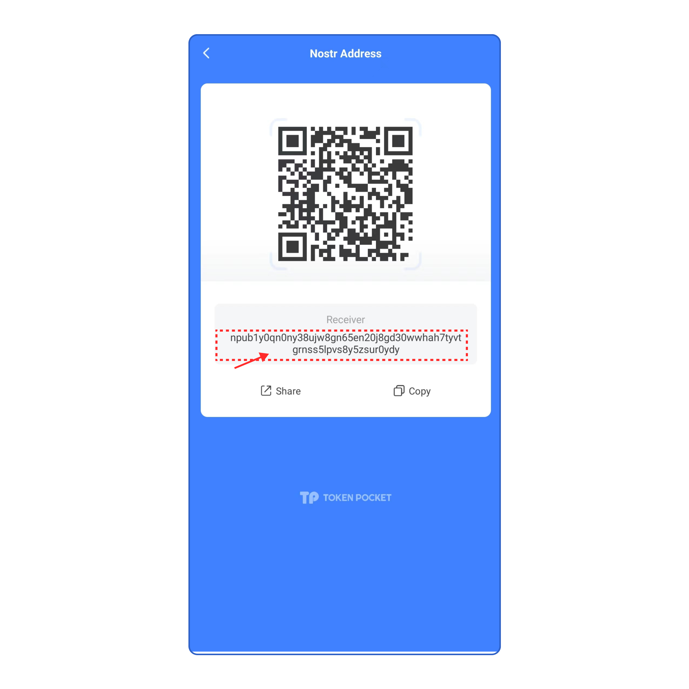 Open TokenPocket [Assets] page, click [>] and enter the Account Details, then click [Nostr Address]. You can get your Nostr Address is this page.