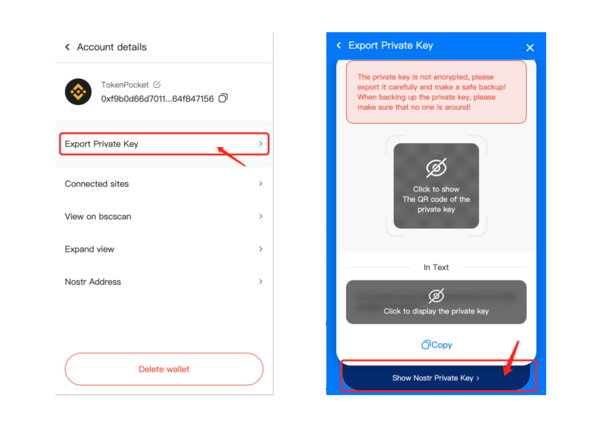 Open TokenPocket [Assets] page, click [>] and enter the Account Details, then click 【 Export Private Key】, click the 【Show Nostr Private Key】button below and you can get your Nostr Private Key.