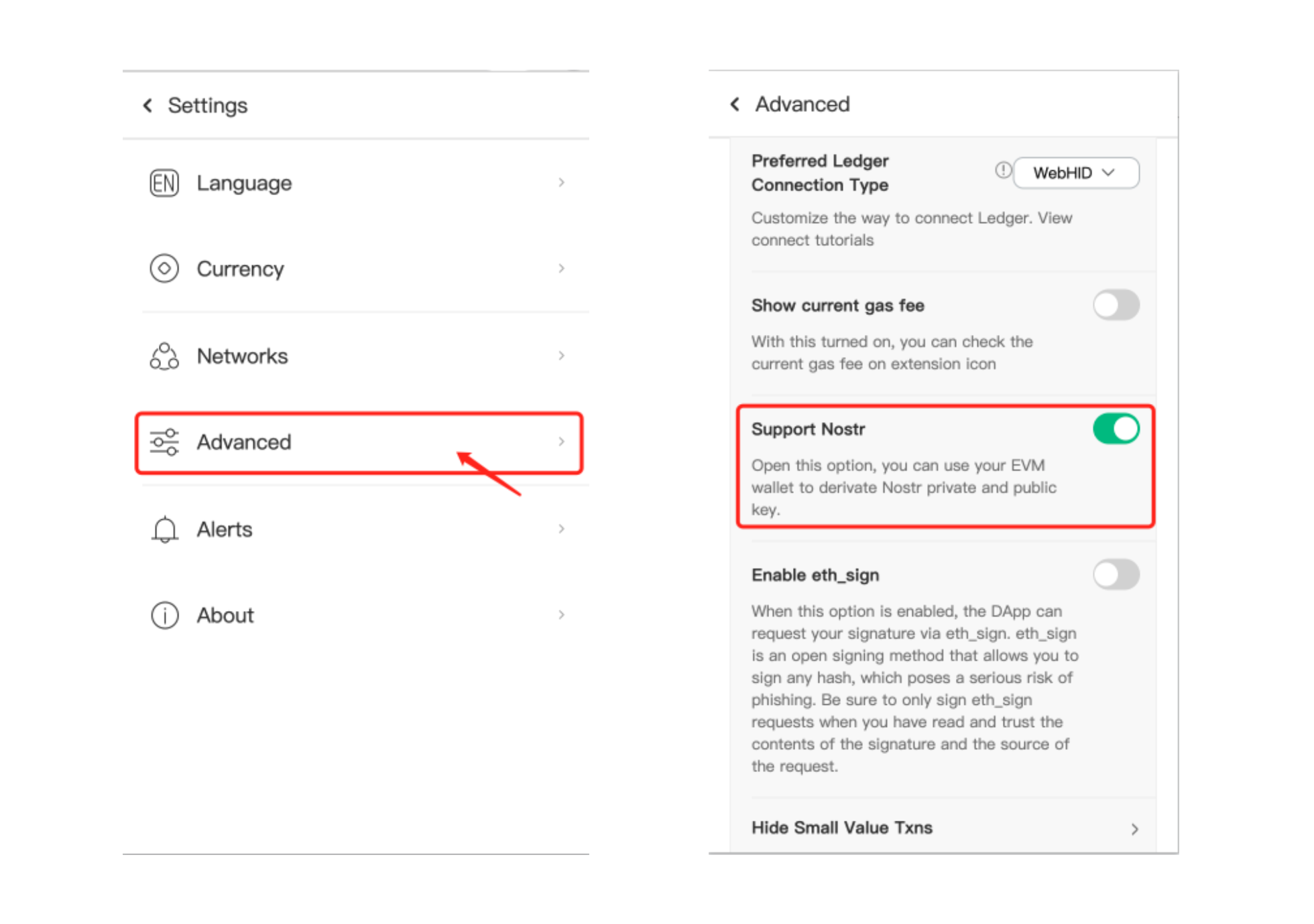 Click 【Advanced】 andTurn on the switch for [Support Nostr], and Nostr will be enabled.