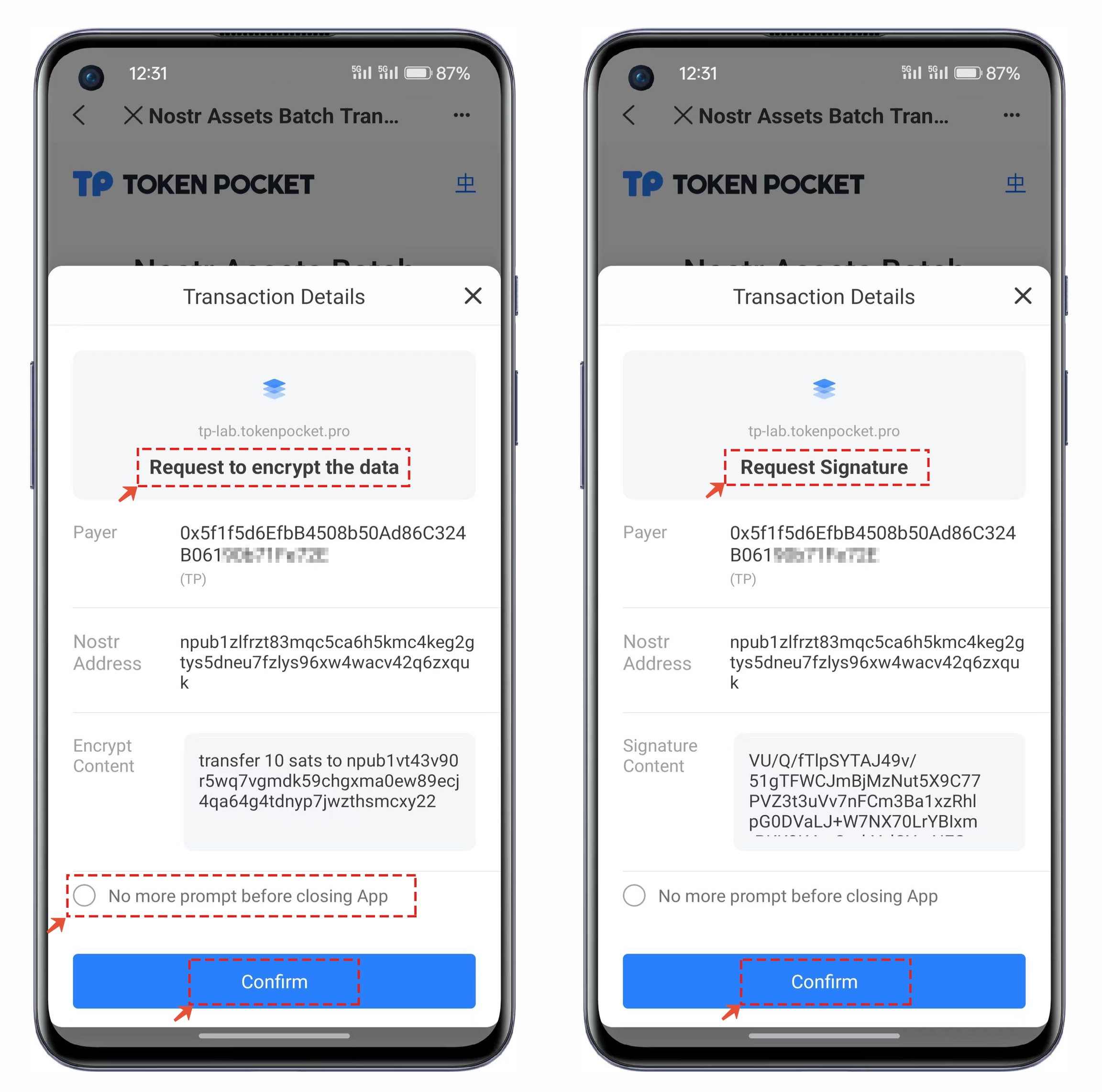 The Nostr Assets batch transfer requires two operations. The first is to "encrypt" the on-chain data, and the second is to "signature" the on-chain events. This tutorial is designed to demonstrate the complete process, but you can simplify the steps by checking the option at the bottom left, which says "Before closing the app, requests from this link do not need to be confirmed again."