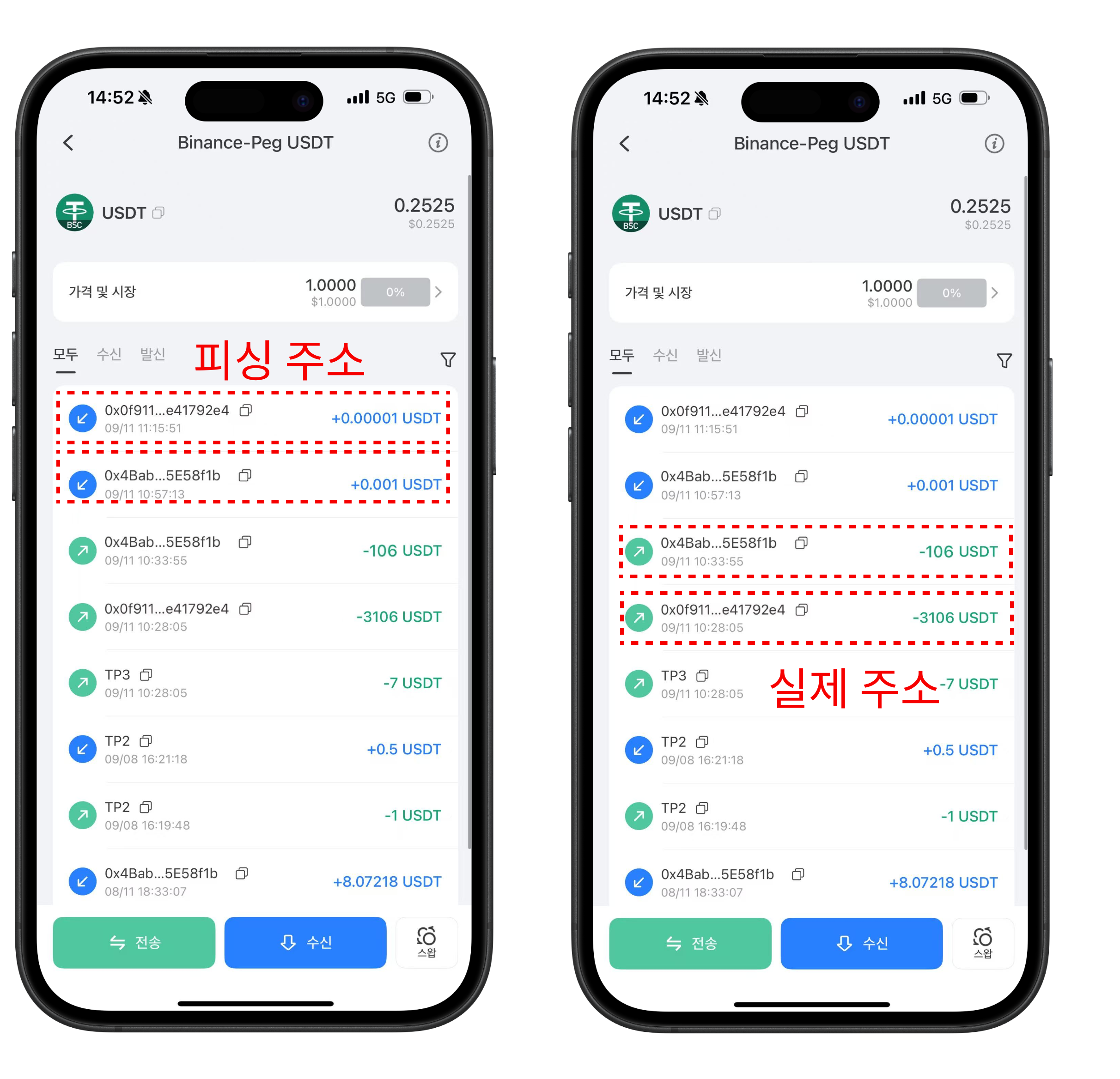 이 사기는 더 "원시적인" 방식으로, 사기꾼들은 일반적으로 체인상에서 대량의 $USDT를 전송하는 주소들을 모니터링하고 거래 기록 내에서 수신자 주소를 찾습니다. 그런 다음 사기꾼들은 "계정 생성기"와 같은 도구를 사용하여 수신자 주소와 매우 유사한 "피싱" 주소를 생성합니다 **(일반적으로 처음 몇 자리 또는 마지막 몇 자리가 수신자 주소와 동일함)**, 그런 다음 이 "피싱" 주소를 사용하여 사용자의 주소로 ***0.001 USDT 또는 0.01 USDT***&#xB97C; 전송하고, 이 전송이 사용자의 거래 기록에 나타납니다. 사용자가 이를 인식하지 못하고 거래 기록에서 "피싱" 주소를 복사하여 전송 페이지에 붙여넣고 전송 작업을 실행하면 됩니다.