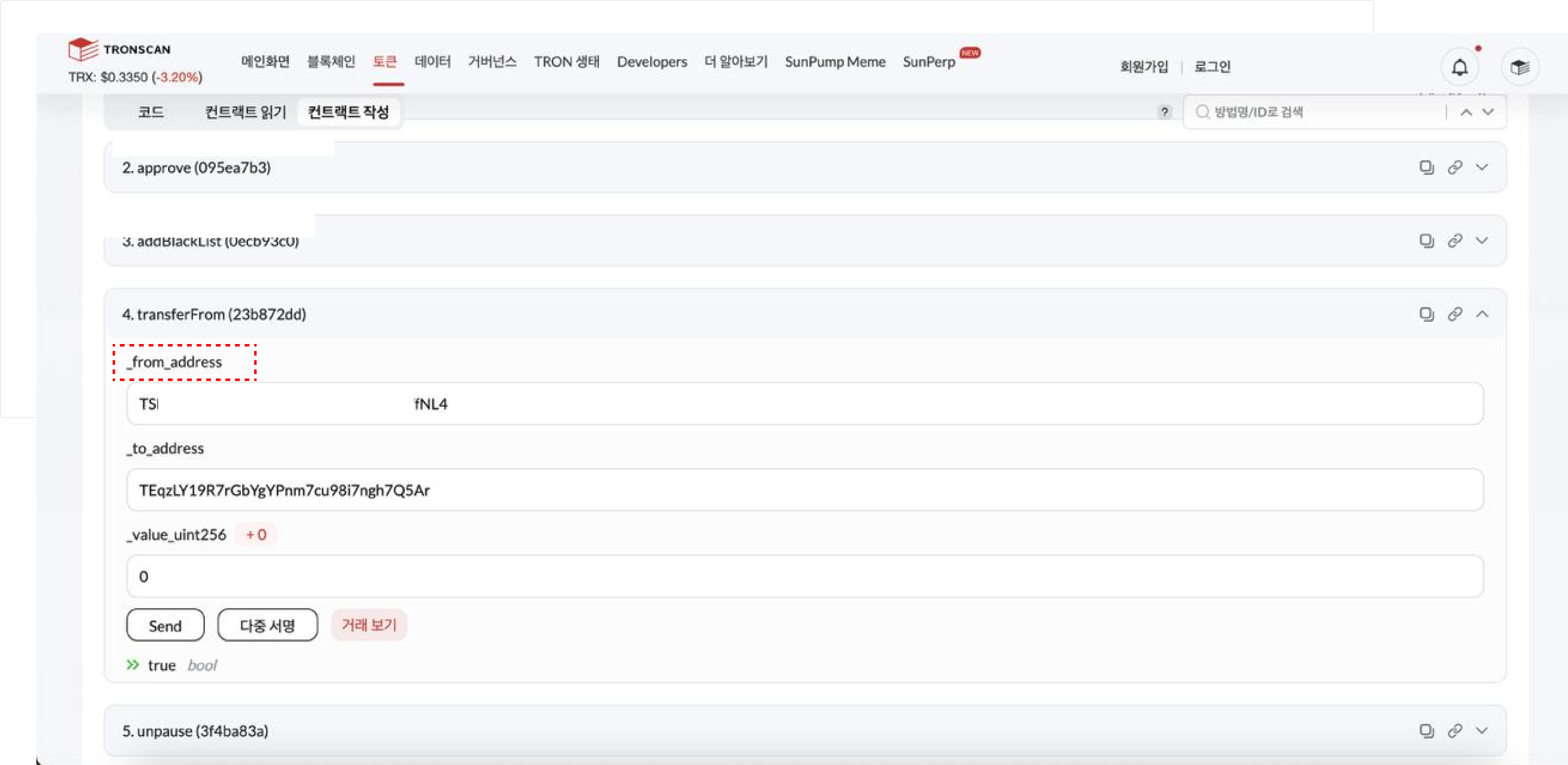 \[\_from\_address], \[\_to\_address\_], 그리고 \[\_value]를 입력한 다음 \[전송]을 클릭할 수 있습니다. \[true]는 작업이 성공했다는 의미입니다. ***이는 간단한 호출 작업으로, 지갑의 \[승인]에 "취소됨"을 표시하는 기록을 추가하게 되며, 또한 이 호출을 통해 지갑에 "0 USDT" 전송 기록이 나타나게 됩니다.***