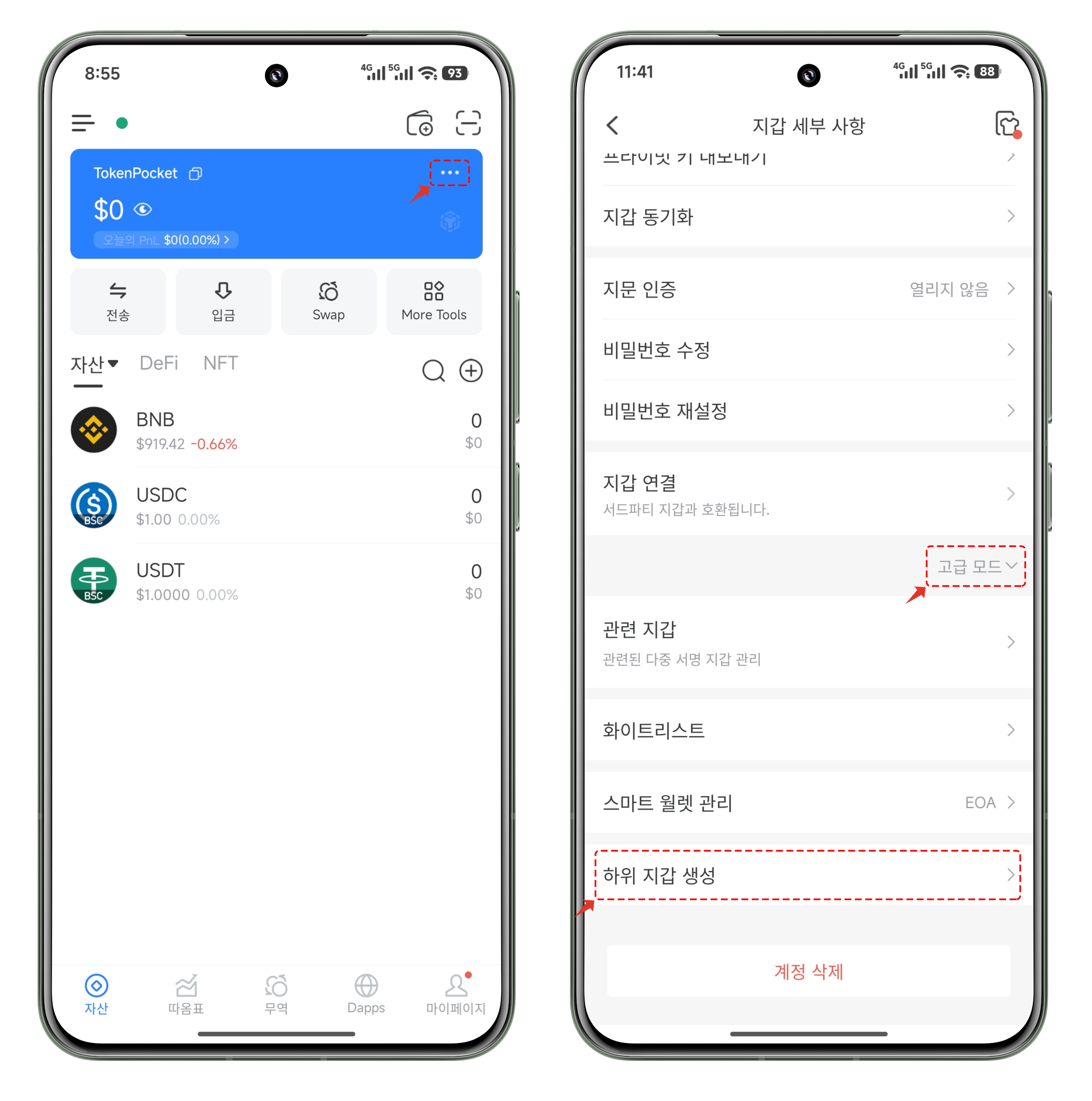 1. TokenPocket에서 BSC 지갑을 열고, 우측 상단 파란 카드의 “세부 정보”를 클릭합니다. 지갑 상세 페이지에서 “고급 모드”를 클릭한 후 “서브 지갑 생성”을 선택합니다.