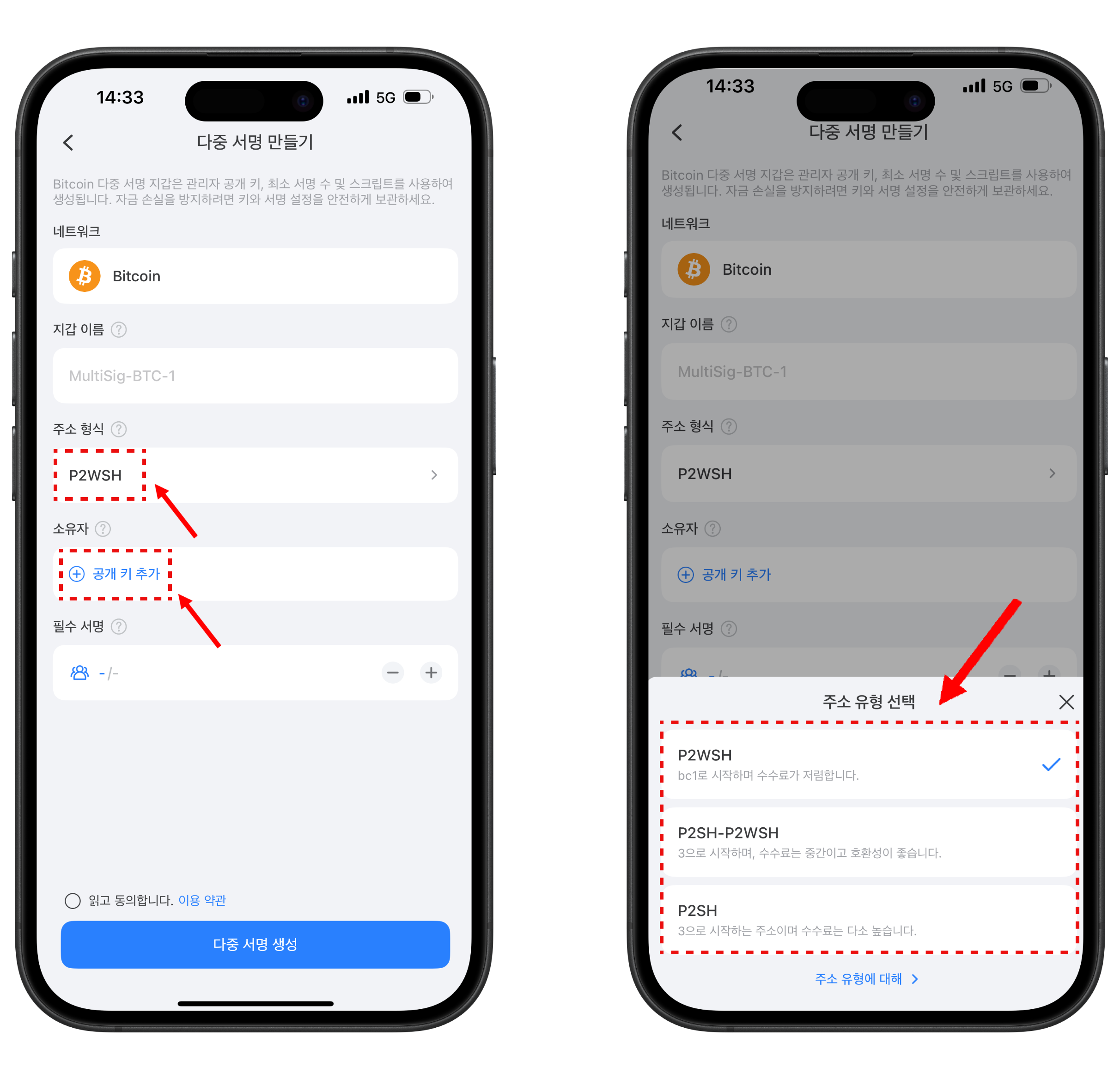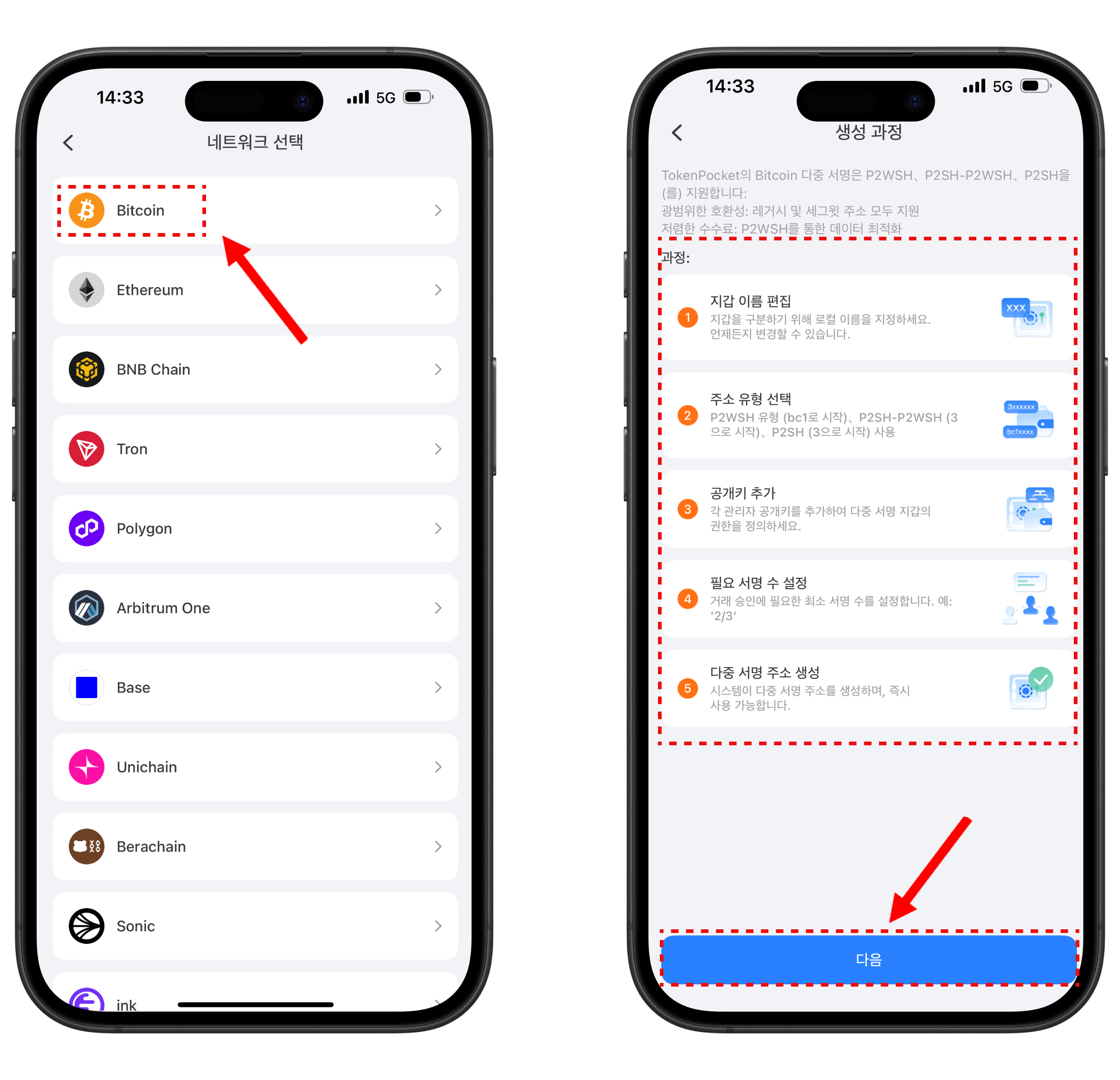 **자세한 내용:** [<mark style="color:blue;">**BTC 다중 서명 솔루션**</mark>](https://help.tokenpocket.pro/en/wallet-faq-en/btc-wallet/address-types)