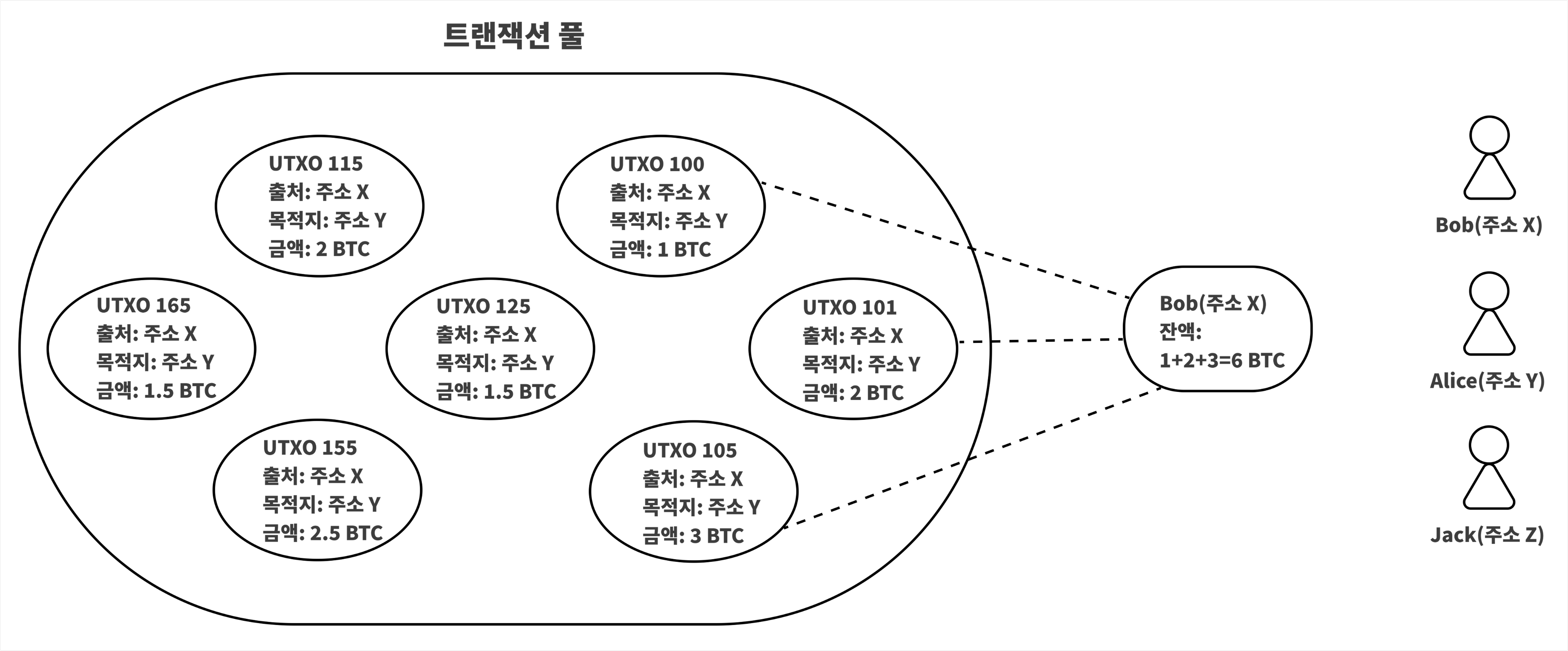 * 출력: 노드 Z가 6 BTC 수령, 노드 X는 7 BTC 잔돈, 노드 Y는 2 BTC 잔돈 — 모두 새로 생성된 UTXO입니다.