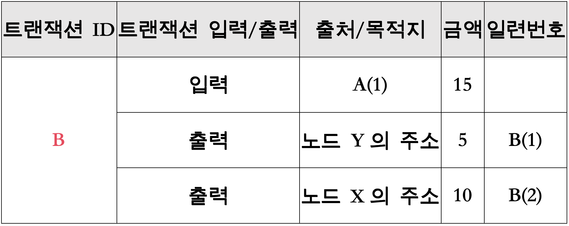 거래 B: 노드 X가 노드 Y에게 5 BTC를 전송합니다. 이 거래는 다음과 같이 표현할 수 있습니다: