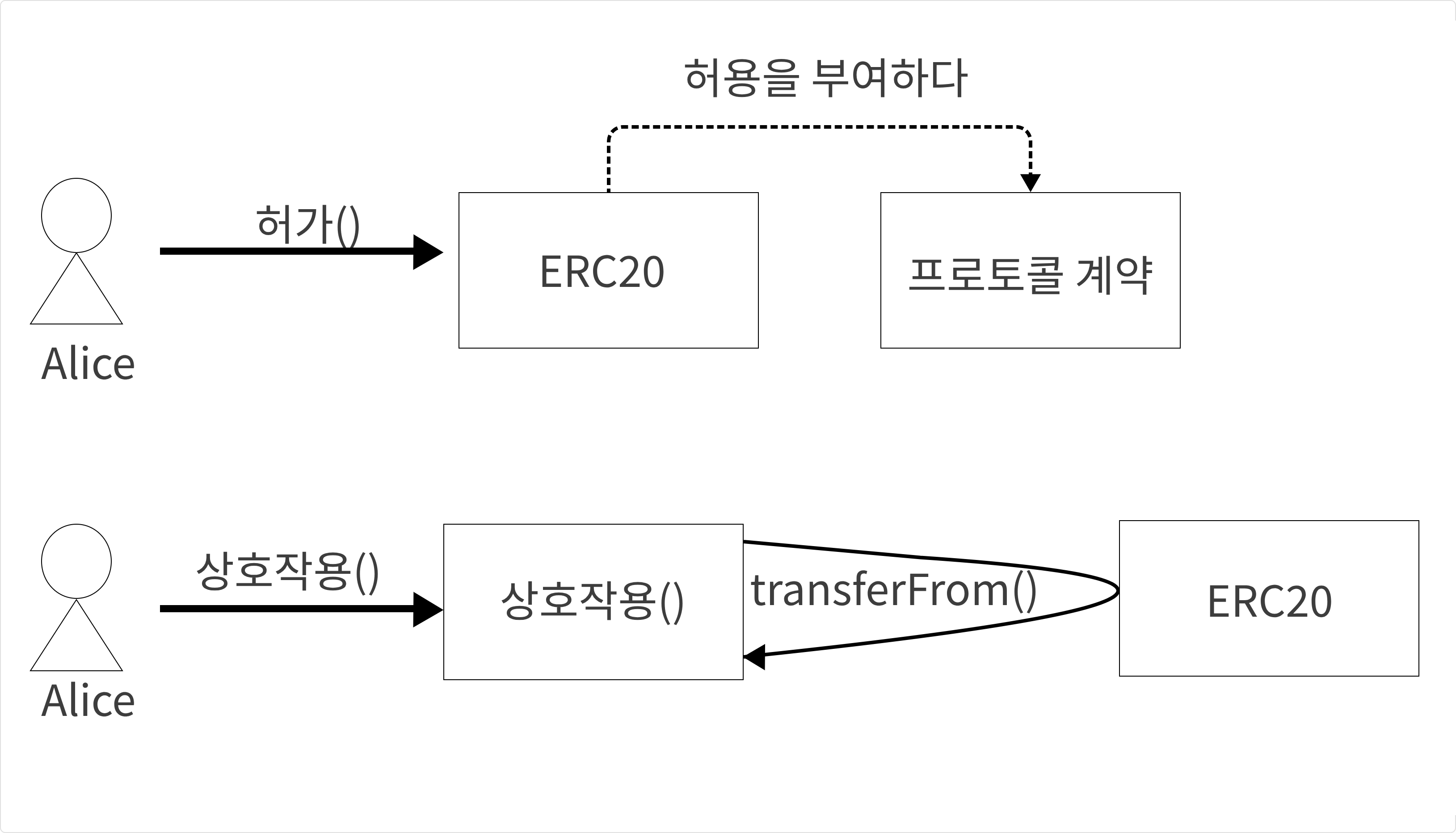 2. Alice는 컨트랙트에서 상호작용 함수를 호출하고, 이 함수는 다시 ERC20 토큰 컨트랙트에서 transferFrom()을 호출하여 그녀의 토큰을 이동시킵니다. 이 모델이 실행 가능하고(널리 존재하므로) 궁극적으로 매우 유연할 수 있음은 명백합니다. 프로토콜이 장기간 사용자의 토큰에 지속적으로 접근할 수 있기 때문입니다.