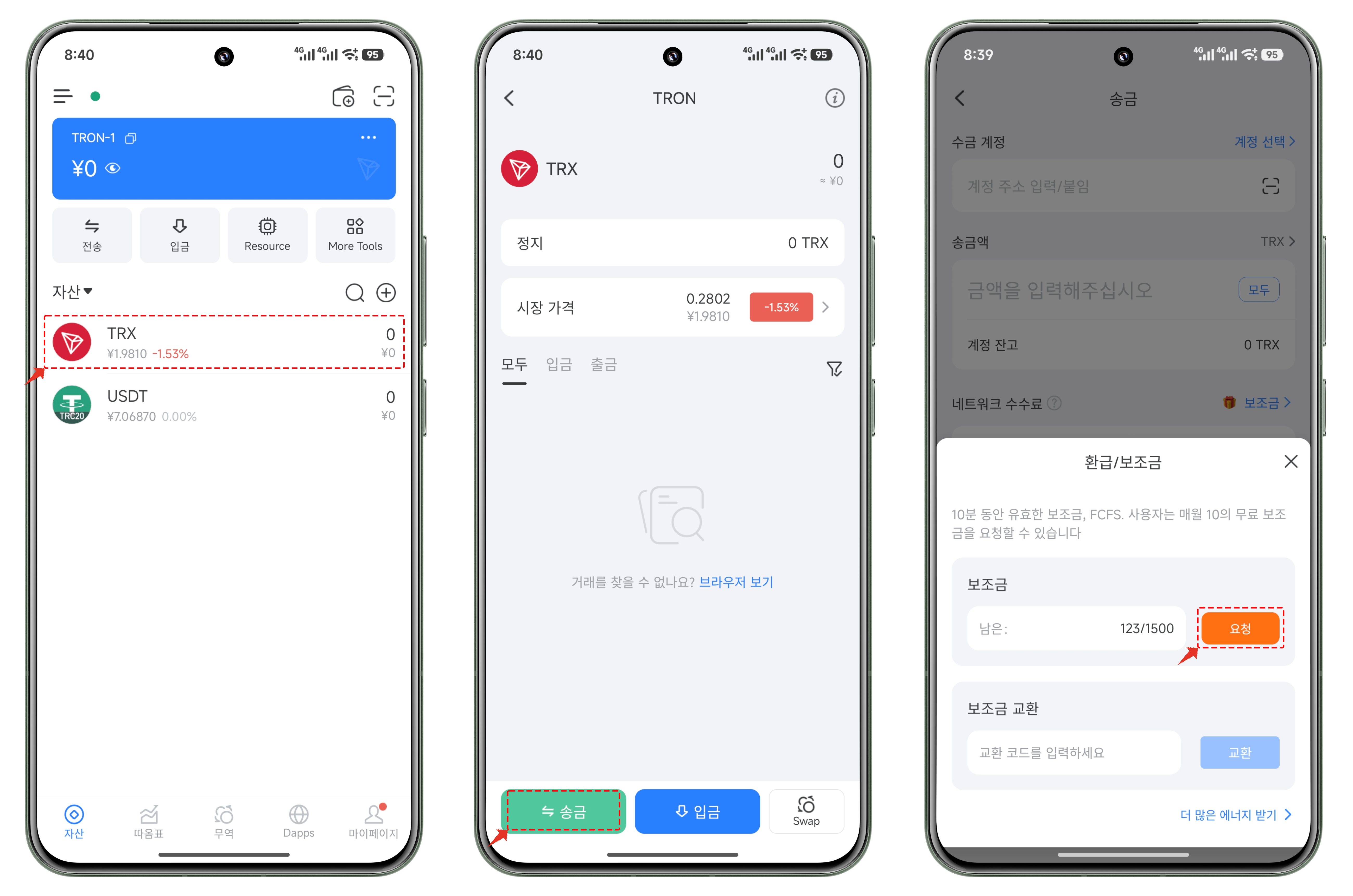 A. 안드로이드 버전: 아무 토큰을 클릭하고 왼쪽 하단의 【전송】을 클릭한 뒤 【일일 보조금】을 클릭하여 전송 보조금을 받으세요.