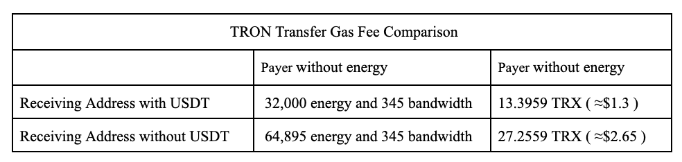 2. 소비되는 에너지와 대역폭의 양은 수취인의 계정에 있는 USDT의 가용성과 밀접한 관련이 있습니다.