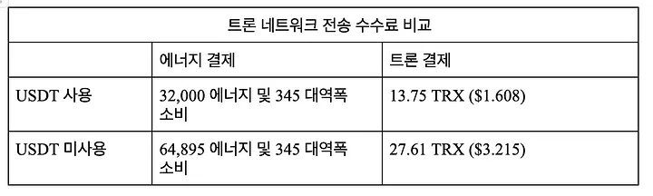TRX 전송은 에너지 없이 대역폭만 소비합니다. TRX 전송은 268 대역폭을 소비하며, TRC20-USDT를 전송하면 13.74 TRX(약 1.608달러) 또는 27.6 TRX(약 3.215달러)의 네트워크 수수료가 발생합니다. 그러나 에너지와 대역폭이 충분하다면 수수료로 TRX가 소진되지 않고 대신 대역폭과 에너지가 소모됩니다. 각 USDT 전송은 345 대역폭을 소비하며(소비되는 에너지와 대역폭, TRX는 트론 블록체인의 조건에 따라 변동), 에너지 소비에는 두 가지 가능한 시나리오가 있습니다.