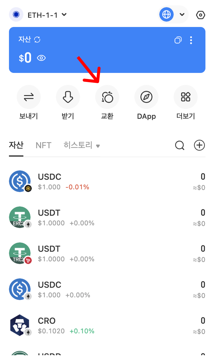 1. TokenPocket 플러그인 지갑을 열고 【교환】을 클릭합니다.