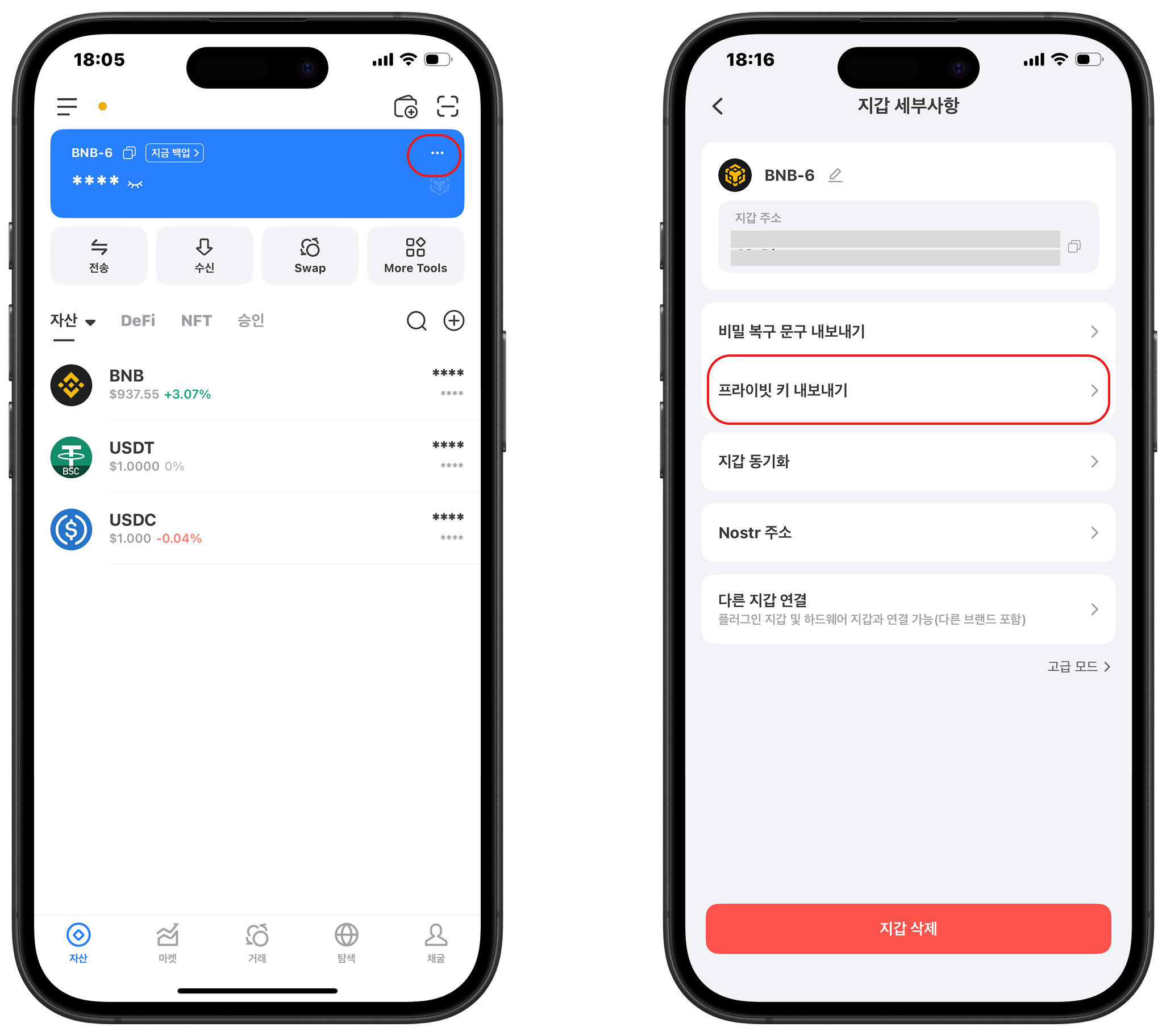 1. TokenPocket <mark style="color:orange;">\[자산]</mark> 페이지를 열고, <mark style="color:orange;">\[상세]</mark>를 클릭한 다음 <mark style="color:orange;">\[프라이빗 키 내보내기]</mark>를 클릭합니다.