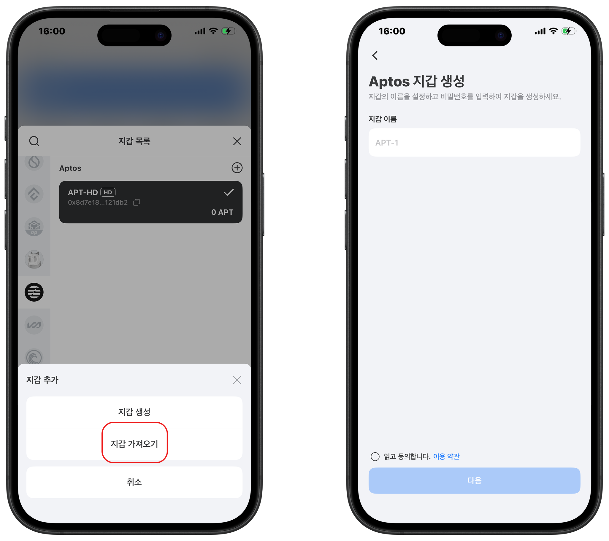 1. TokenPocket 앱을 열고 왼쪽 상단 네트워크 아이콘을 클릭하여 지갑 네트워크를 Aptos로 전환합니다. **\[지갑 생성]**&#xC744; 클릭하고 **\[지갑 가져오기]**&#xB97C; 클릭합니다. 개인 키 또는 복구 구문을 입력하여 지갑을 가져올 수 있습니다.