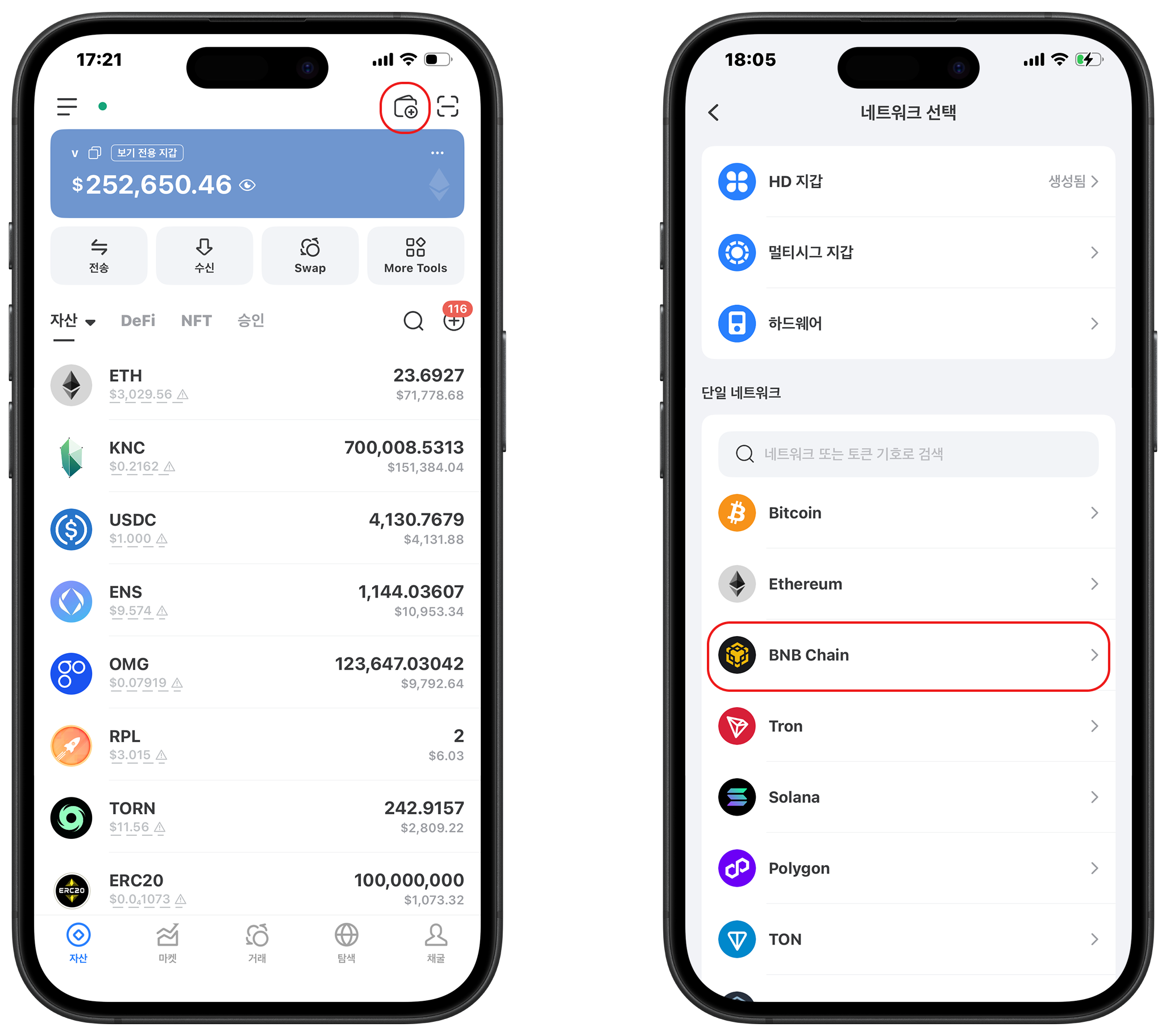1\. [TokenPocket](https://www.tokenpocket.pro/)을 열고, 오른쪽 상단의 지갑 아이콘을 클릭한 후, 페이지를 아래로 스크롤하여 BSC 네트워크를 찾아 클릭하세요.