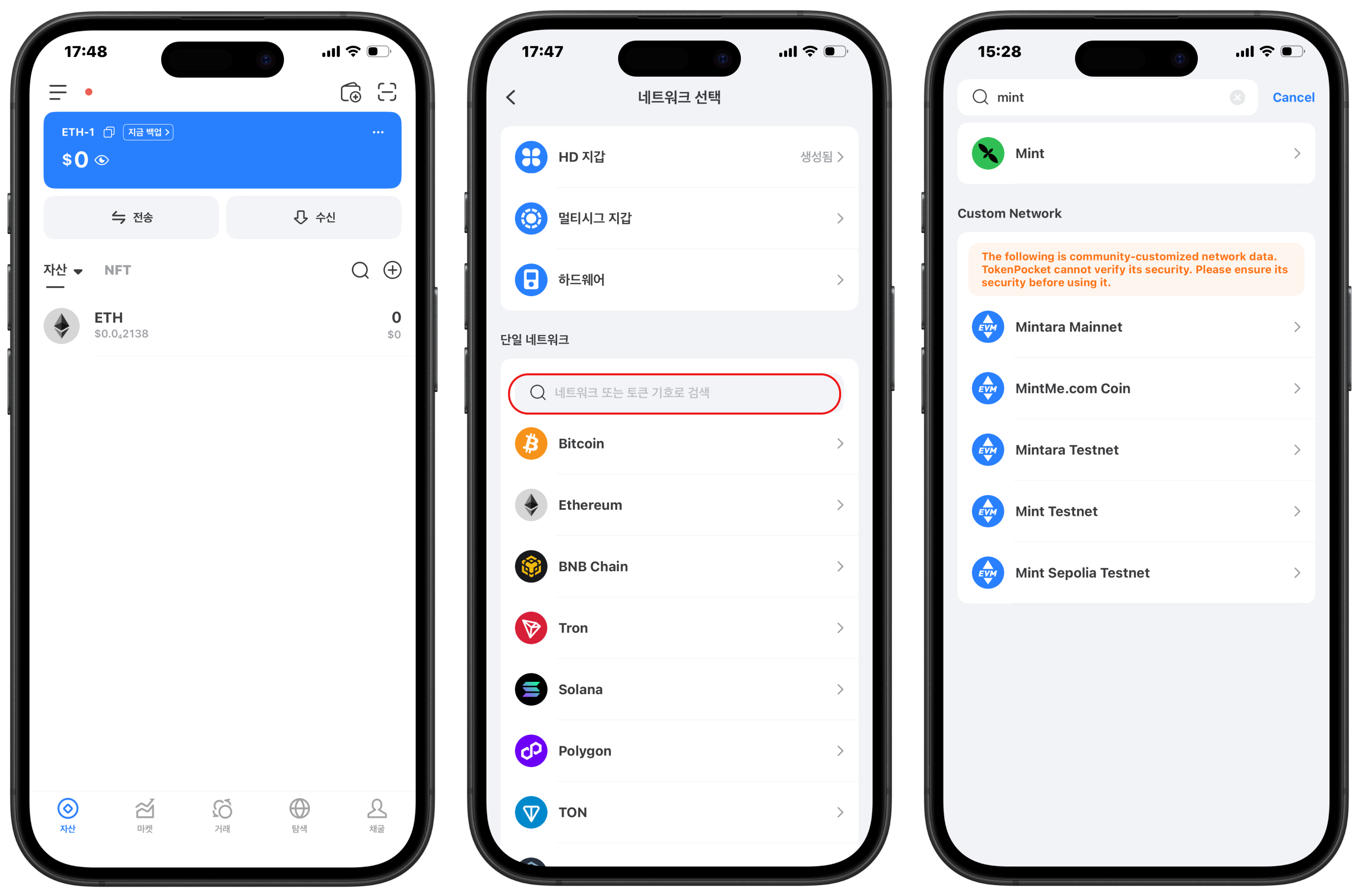 **TokenPocket** [**Chrome Extension**](https://extension.tokenpocket.pro/#/) **및** [**Mobile Wallet**](https://www.tokenpocket.pro/en/download/app) **은 Mint Network를 지원합니다.**