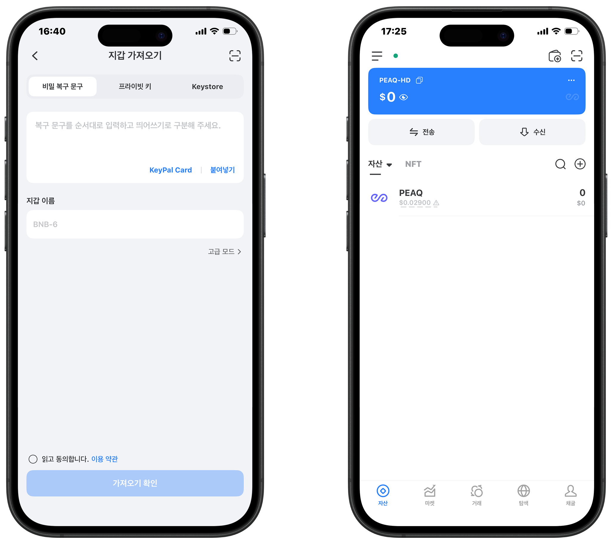 <figure><img src="https://2635091210-files.gitbook.io/~/files/v0/b/gitbook-x-prod.appspot.com/o/spaces%2F-MYDTQZz8SAKtEV8VeYE%2Fuploads%2F816gbwgvgPTmqVG1mtKy%2Fpeaq-importwallet-2.png?alt=media&#x26;token=90b3d506-3ecd-4d93-b4c8-c7053f2e20c8" alt=""><figcaption></figcaption></figure>