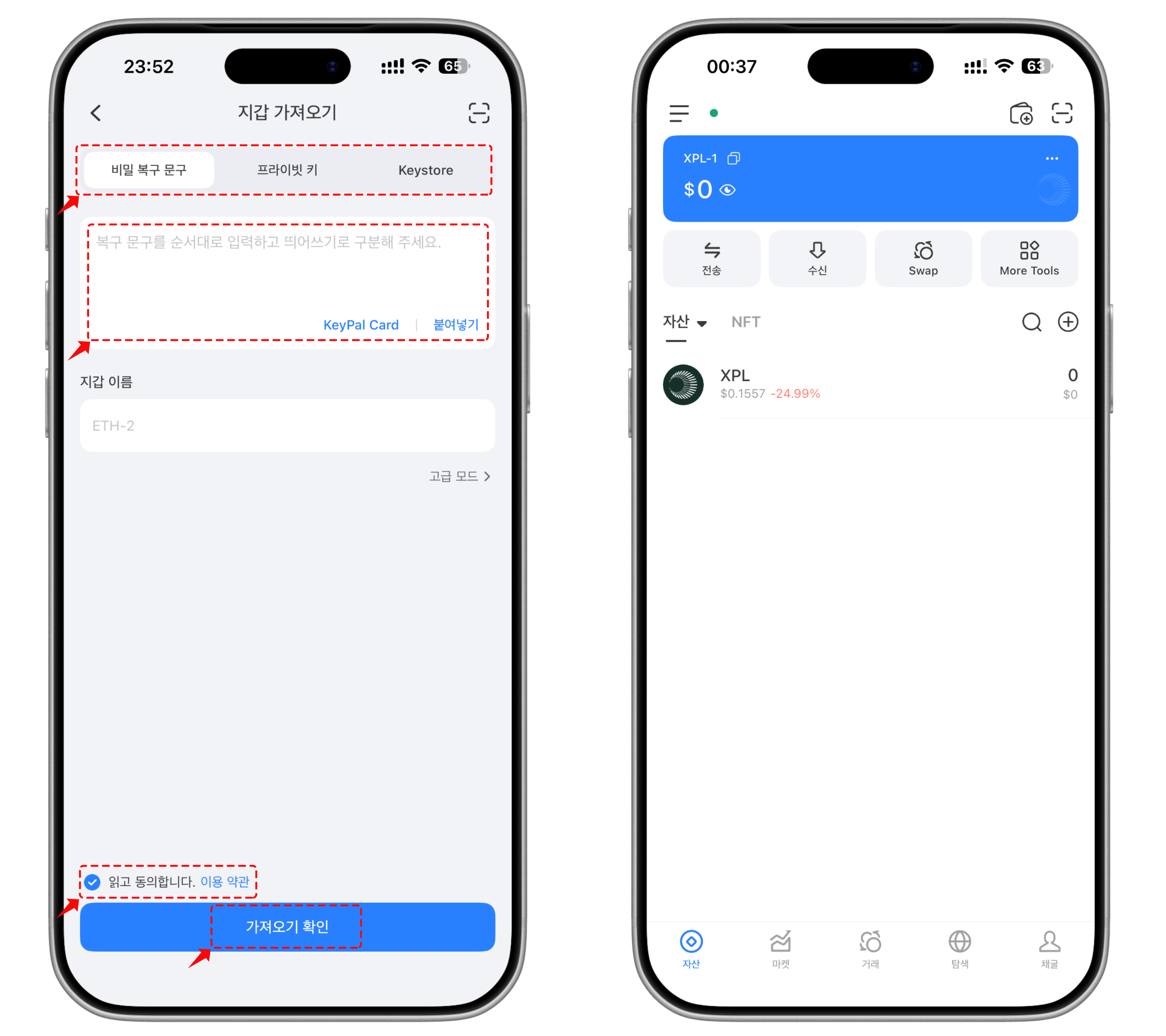**팁:** 이전에 [PassPhrase](https://help.tokenpocket.pro/kr/security-knowledge/security-measure/passphrase)를 설정한 경우, 올바른 주소에 액세스하려면 가져오기 중에 PassPhrase를 입력해야 합니다. 자세한 내용은 위의 링크를 클릭하세요.