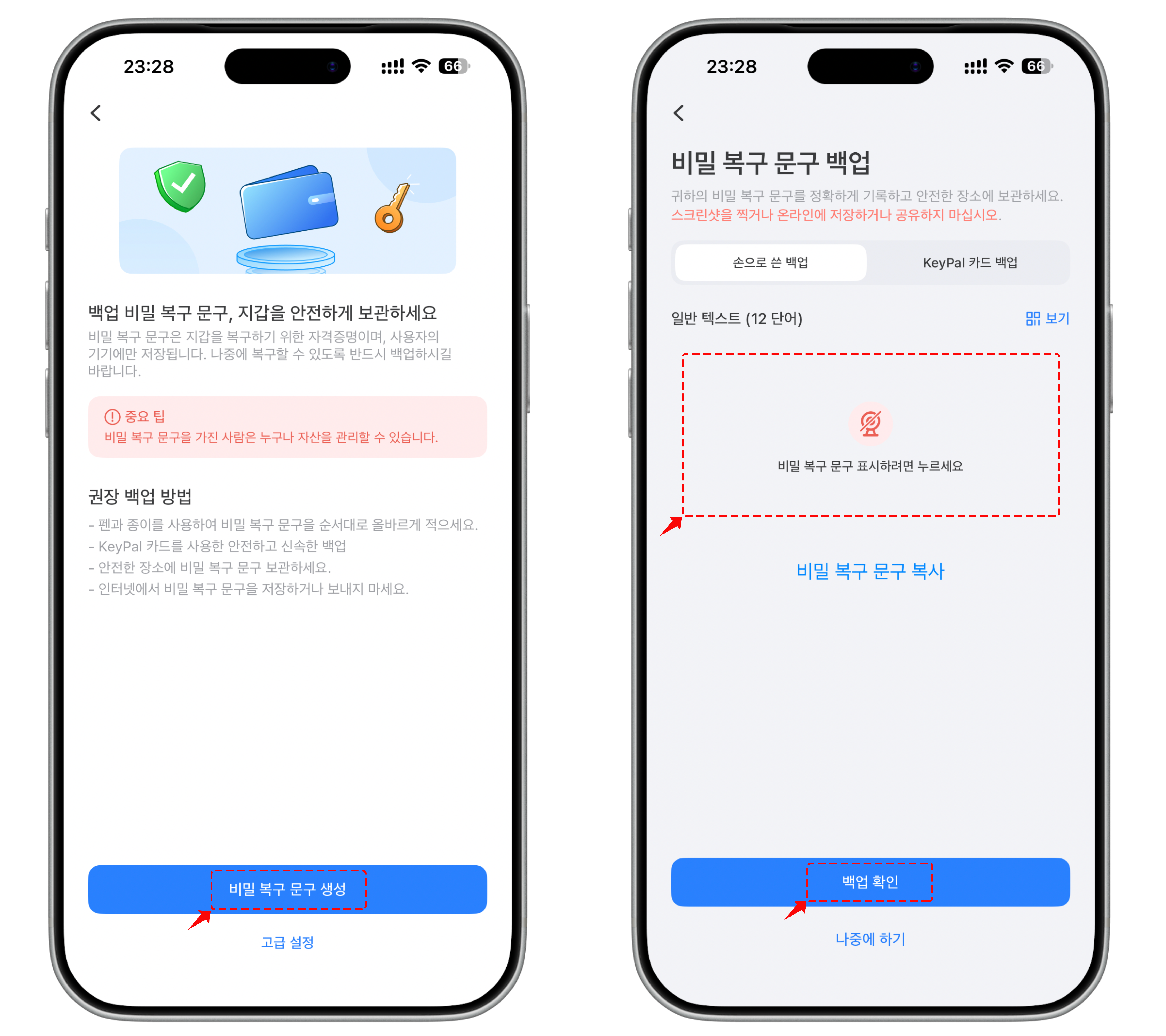 복구 구문을 종이에 작성하고 안전한 곳에 보관하세요. **\[복구 구문 생성]**&#xC744; 탭하고 프롬프트에 따라 복구 구문을 확인하세요.