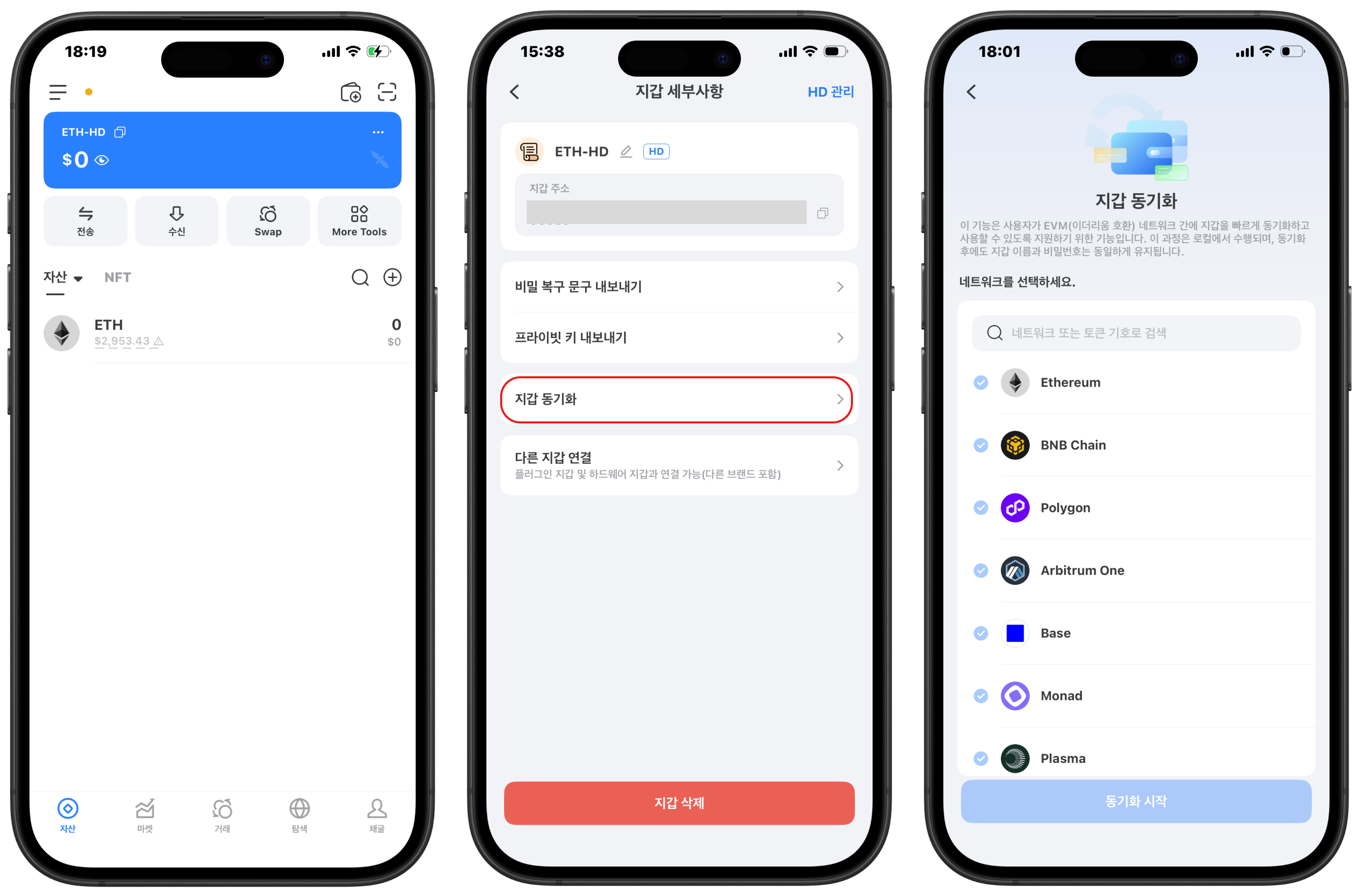 2. “지갑 동기화”를 클릭하고 동기화할 네트워크를 선택한 후, “동기화”를 클릭하여 모든 작업을 완료하세요.