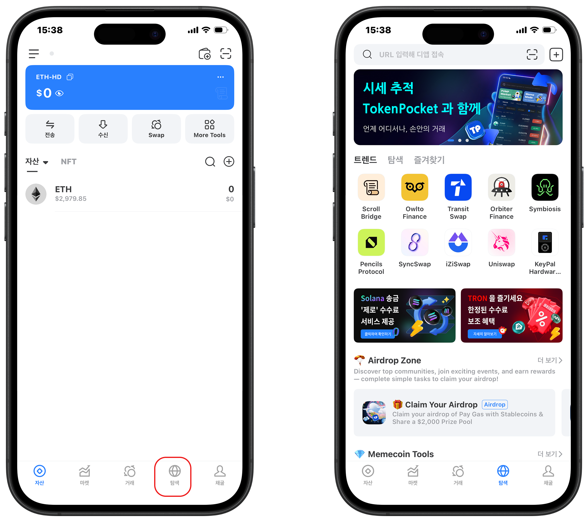 **TokenPocket** [**Chrome 확장 프로그램**](https://extension.tokenpocket.pro/#/) **및** [**모바일 지갑**](https://www.tokenpocket.pro/en/download/app) **은 Scroll Network를 지원합니다.**