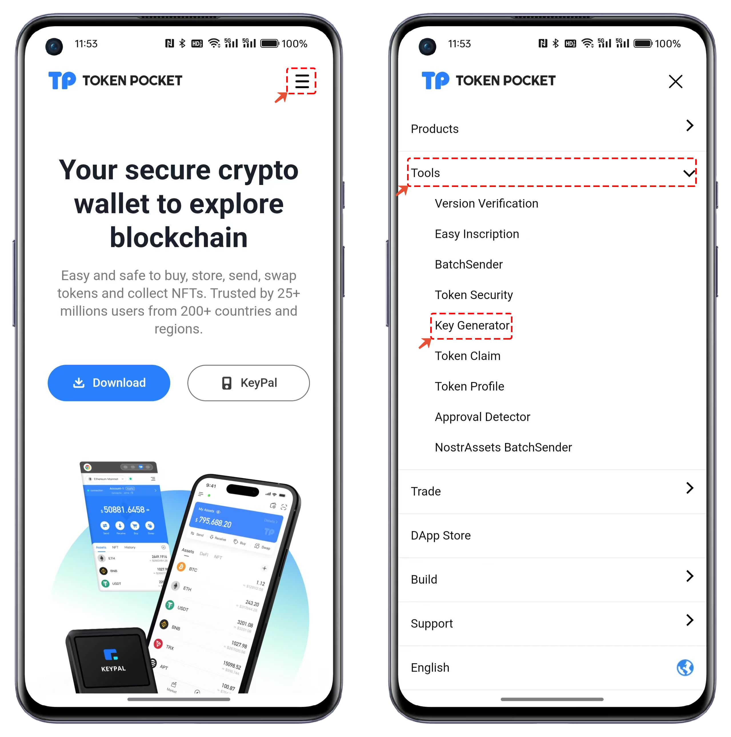 1\. TokenPocket 공식 웹사이트를 엽니다: [www.tokenpocket.pro](http://www.tokenpocket.pro), 우측 상단의 메뉴를 클릭하고 목록에서 \[도구] -- \[키 생성기]를 선택합니다.