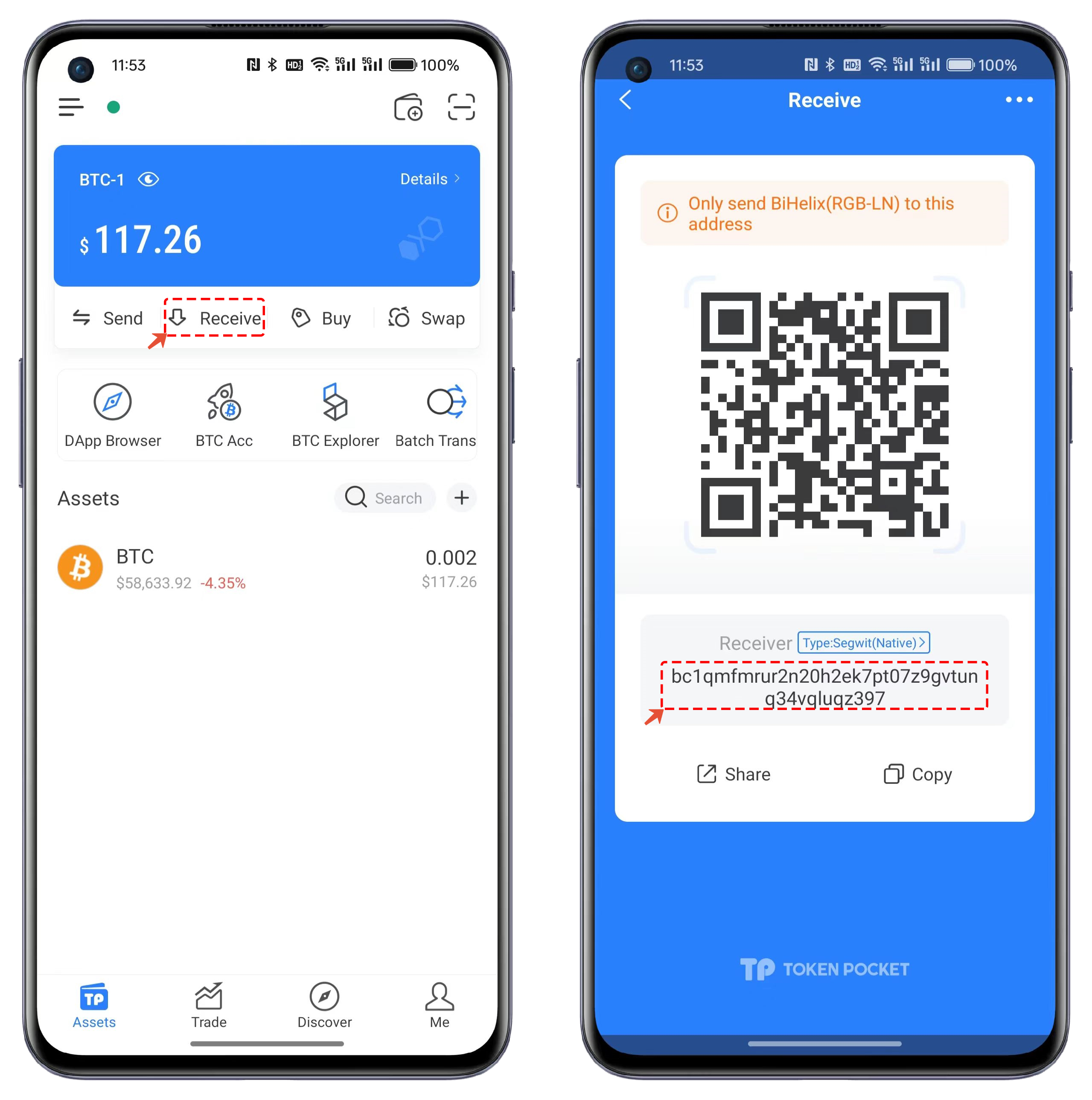 2）BTC 수신: BTC를 RGB 네트워크 주소로 전송합니다. BTC를 구매하거나 다른 사람으로부터 BTC를 받을 수 있습니다. BTC가 주소로 전송될 때마다 새로운 UTXO가 생성됩니다. 구체적인 작업과 관련하여 TokenPocket 지갑에서 0.00002BTC 이상을 전송하여 UTXO 수가 BiHelix (RGB-LN) 네트워크 에어드롭 토큰을 성공적으로 수신하기에 충분하도록 하는 것이 좋습니다.