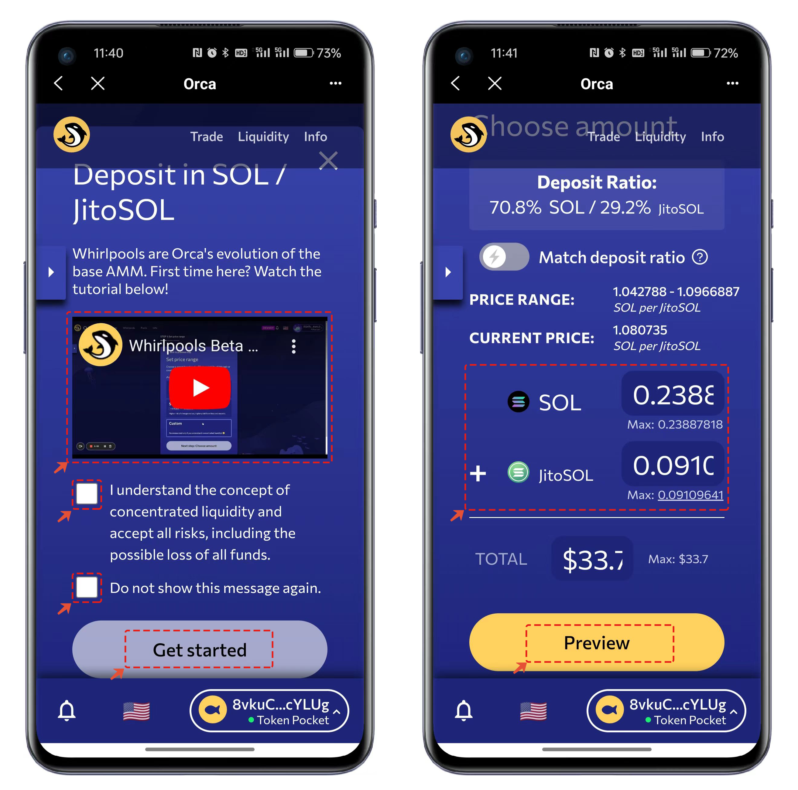6. 진행 중 필요에 따라 공식 튜토리얼 영상을 볼 수 있다. 안내를 확인한 뒤 "Get started" 메뉴로 이동해 입금할 수량을 설정하고, "Preview"를 눌러 온체인 서명 작업을 수행한다.
