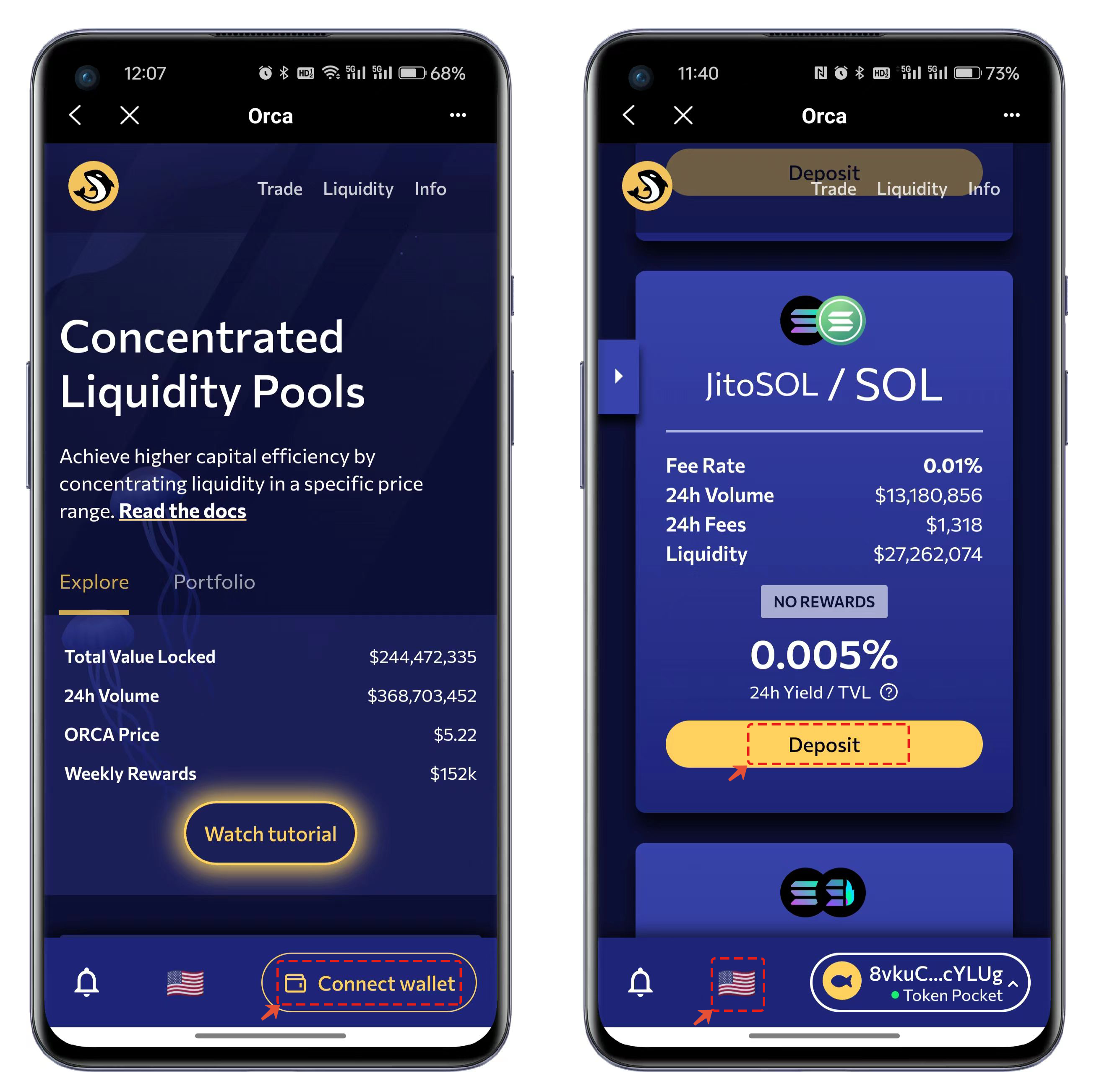 5. 메뉴에서 "Liquidity"를 선택한다. 첫 방문 시에도 "Connect Wallet"이 필요하므로 TokenPocket을 선택해 연결한다. 리스트에서 입금할 토큰 페어를 선택(예: jitoSOL/SOL)한 뒤 "Deposit"을 클릭해 완료한다.