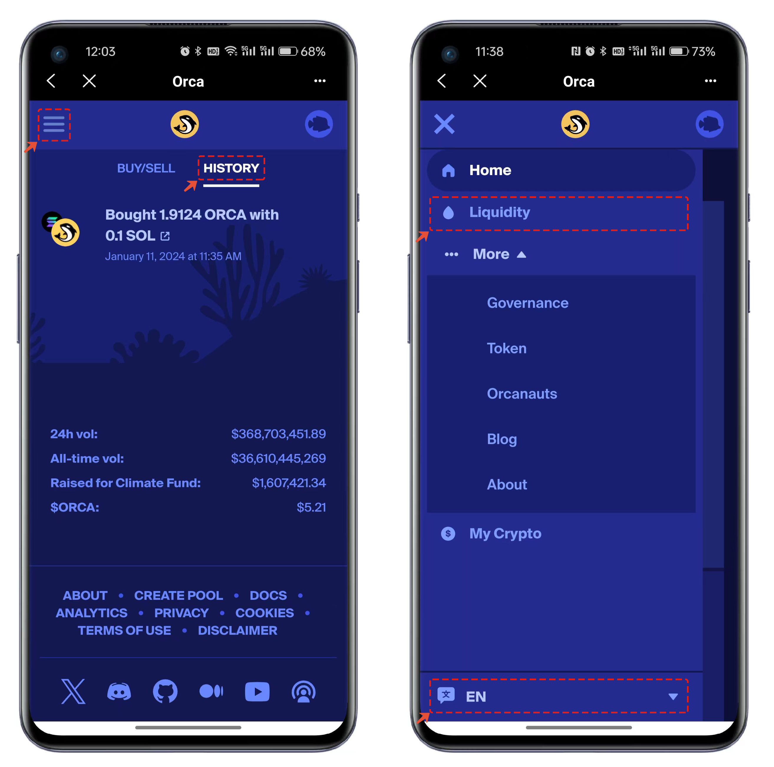 4. 거래 기록을 확인하려면 "HISTORY"를 클릭한다. 좌측 상단 메뉴에서 Orca의 모든 기능을 확인할 수 있고, 하단 언어 전환에서 지원 언어를 선택할 수 있다.