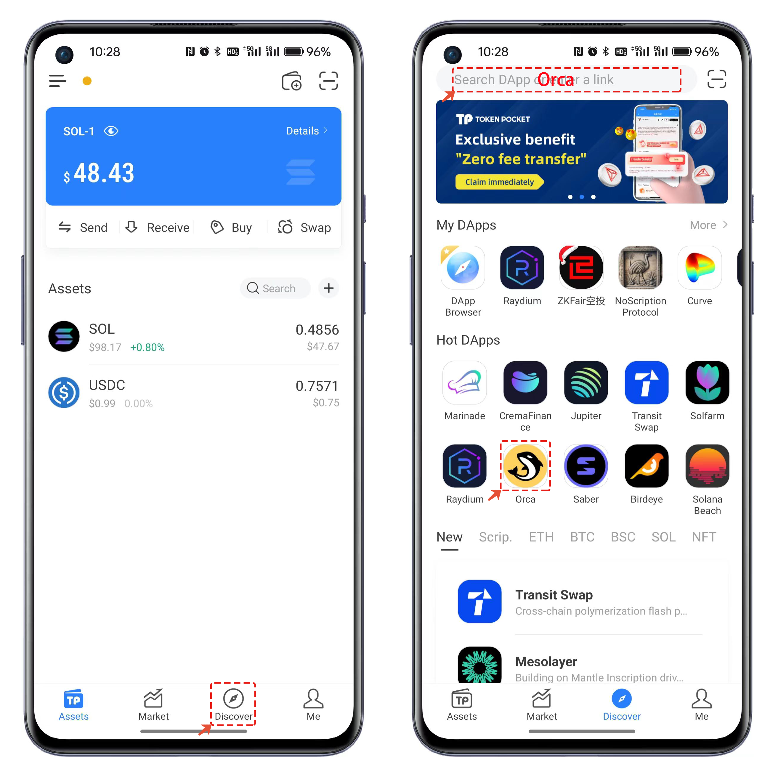 1. TokenPocket을 열고 【Discover】를 클릭한 뒤, 【Popular DApps】 또는 상단 주소창에서 【Orca】를 검색해 DApp을 연다.