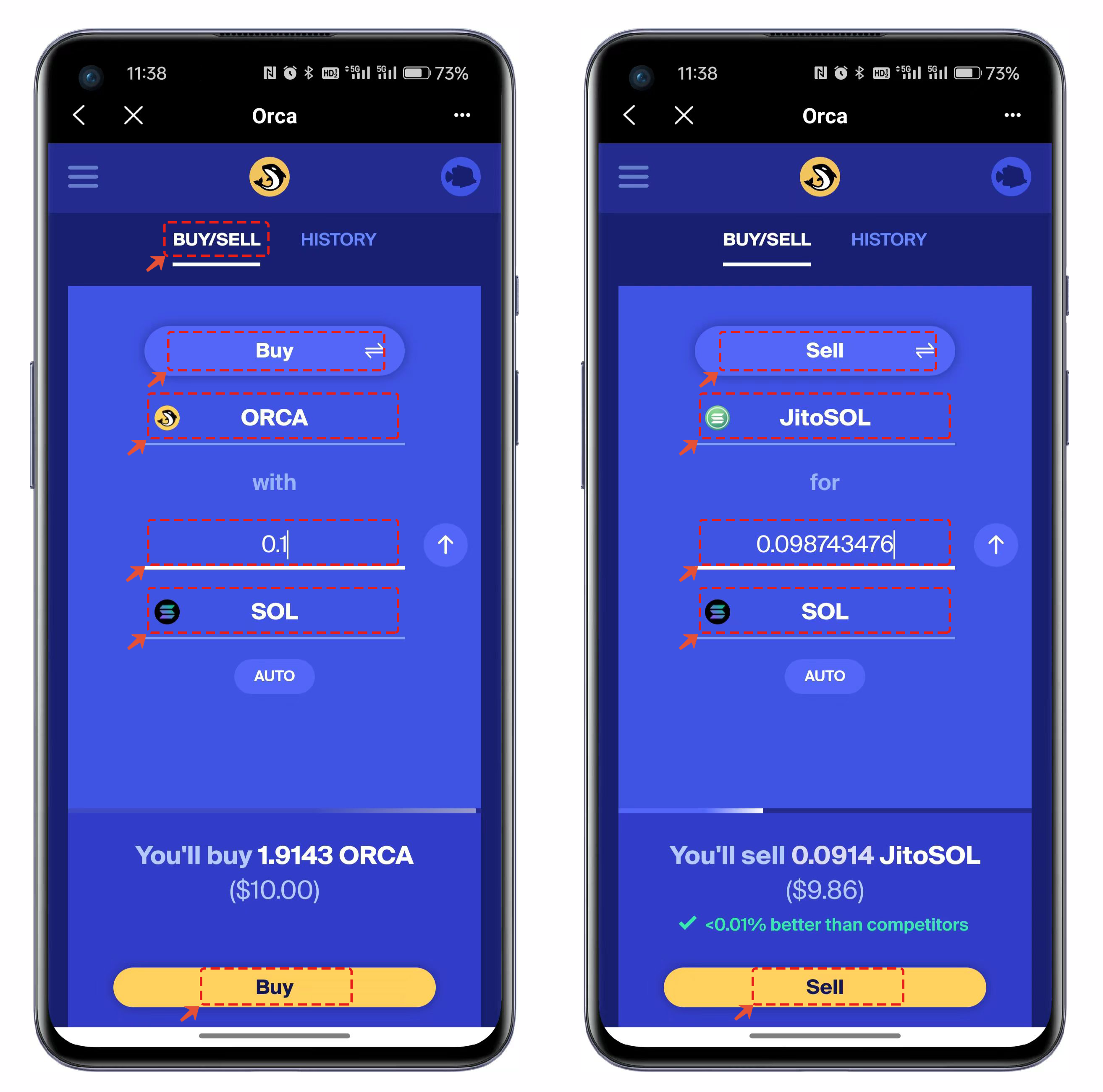 3. 지갑 연결 후 기본 화면은 토큰 거래 인터페이스다. "Buy"를 클릭하면 "Sell" 기능으로 전환되어 매수/매도를 선택할 수 있다. 나머지 조작은 일반 Swap과 유사하며, 교환할 토큰과 수량을 설정한 뒤 "Buy" 또는 "Sell"을 눌러 온체인 실행한다.