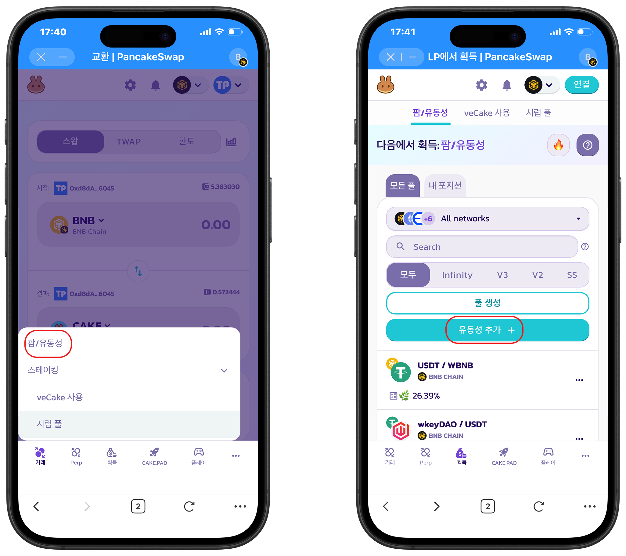 1.두 단계로 진행: **허가(Approve)** → **유동성 공급(Add Liquidity)**. 하단 【Earn】 → 【Farm/Liquidity】 → 【Add Liquidity】로 이동한다.<br>