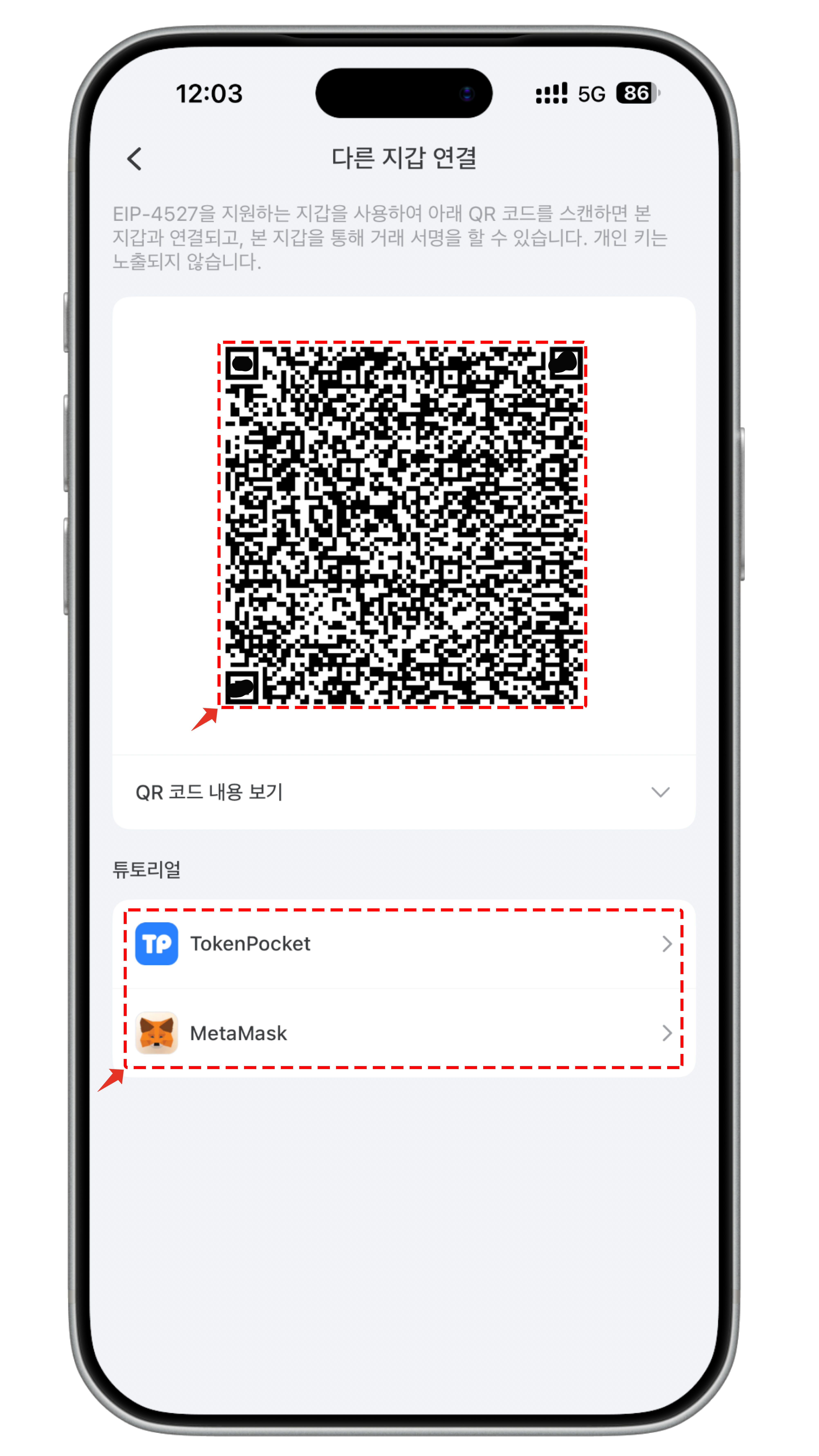 2. 지갑 연결을 위한 QR 코드를 표시하려면 \[비밀번호 확인]이 필요합니다. 확인 후 QR 코드를 볼 수 있습니다. 인터페이스에서 QR 코드 내용을 확인할 수 있습니다. 아래는 EIP-4527을 지원하는 지갑과 상호작용하는 튜토리얼입니다. EIP-4527을 지원하는 다른 지갑들도 이와 유사한 상호작용 방식을 가집니다.