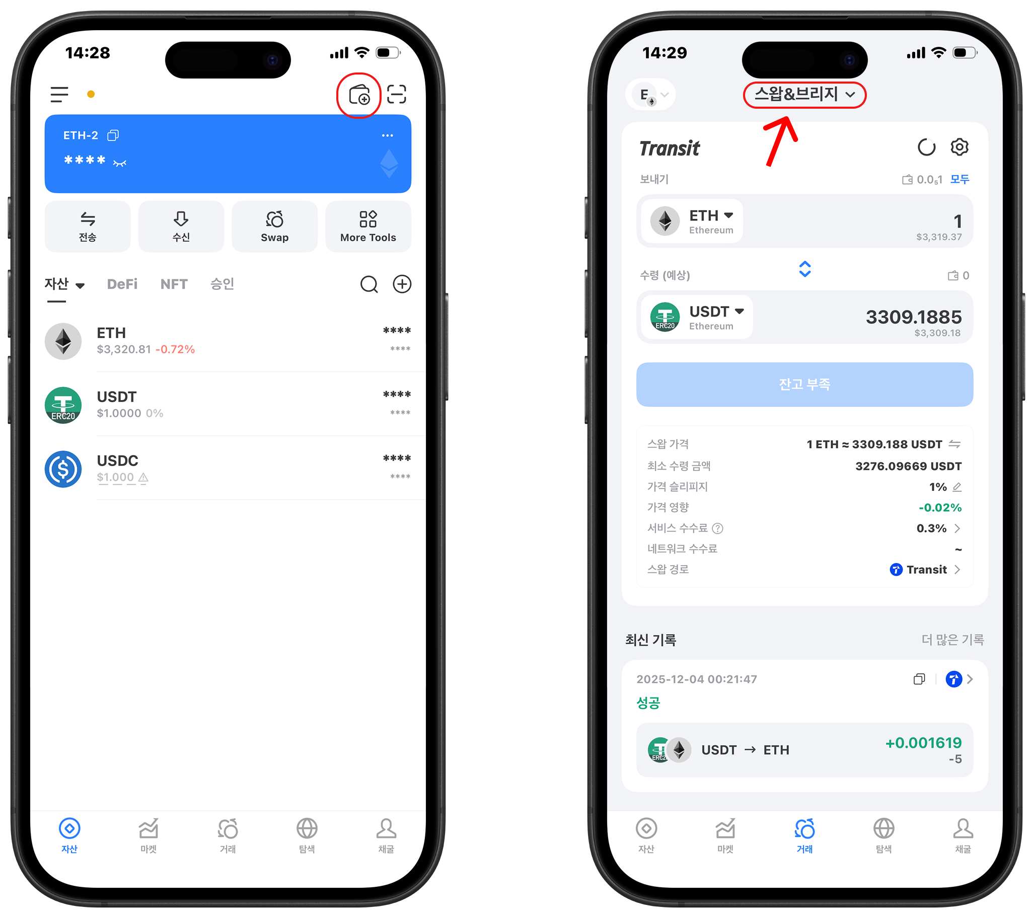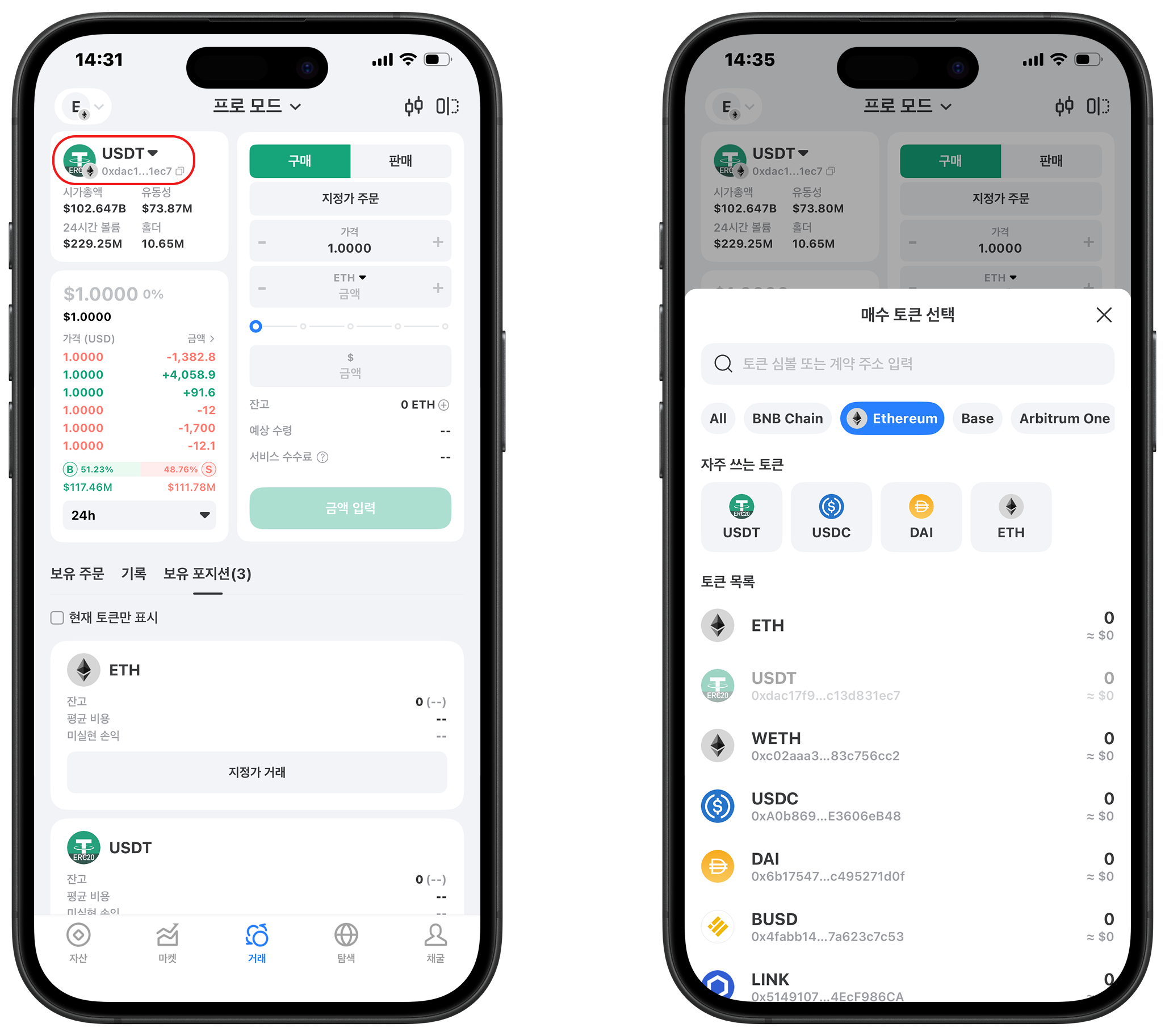 이미지 왼쪽 상단의 위치를 클릭하여 거래에 필요한 네트워크와 지갑을 선택합니다.